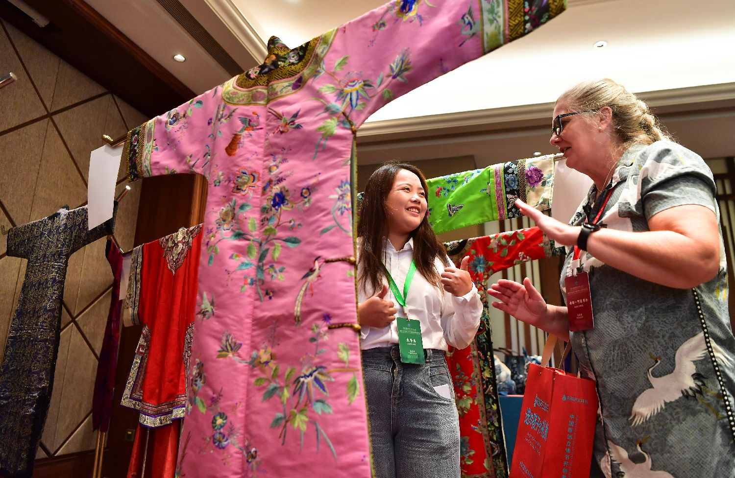 参会外宾27日在了解展示的服饰。(图片来源:中新社)
