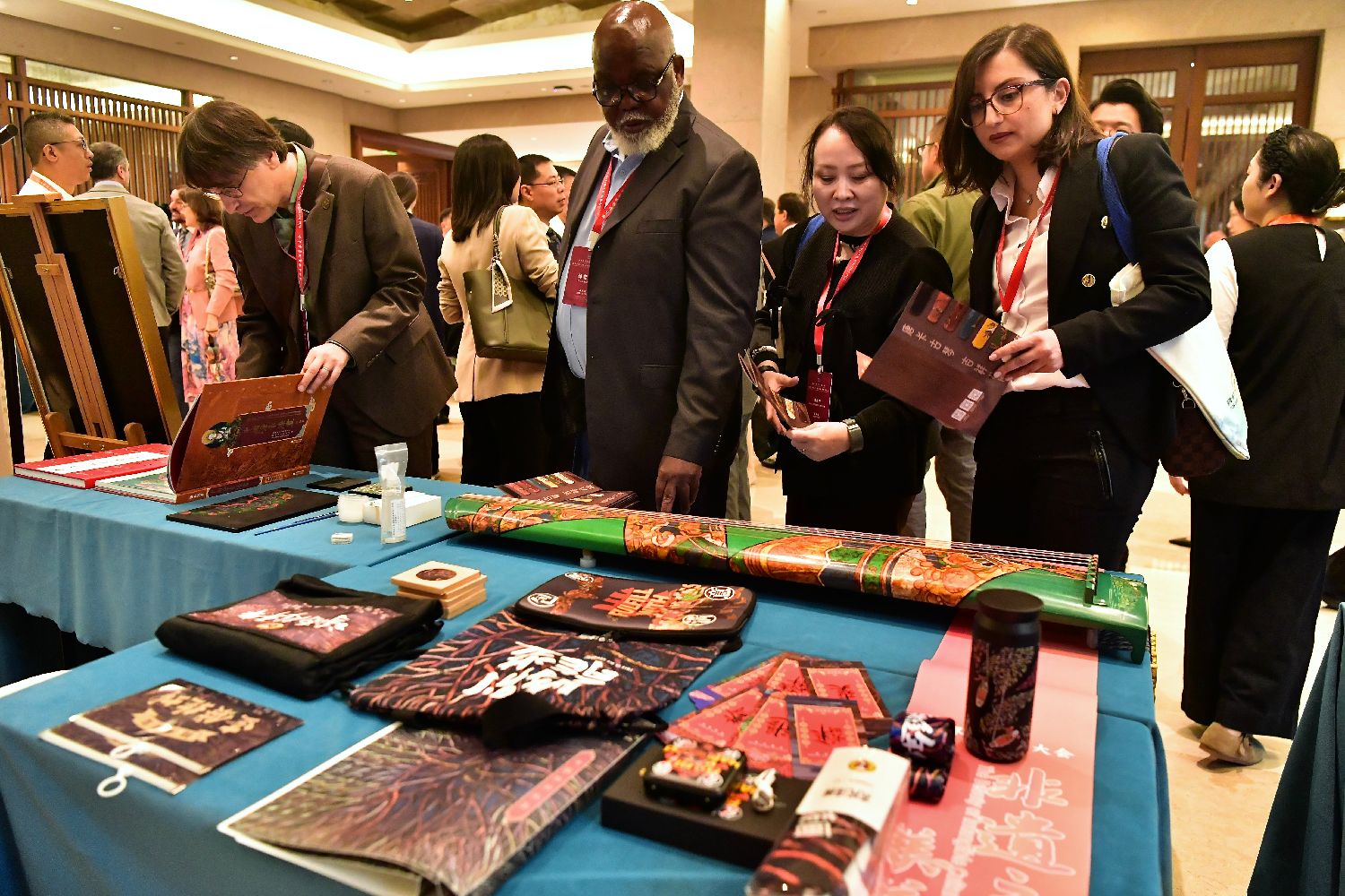 活动上举行的非物质文化遗产项目展示吸引参会嘉宾27日在参观福建漆艺文创产品。(图片来源:中新社)