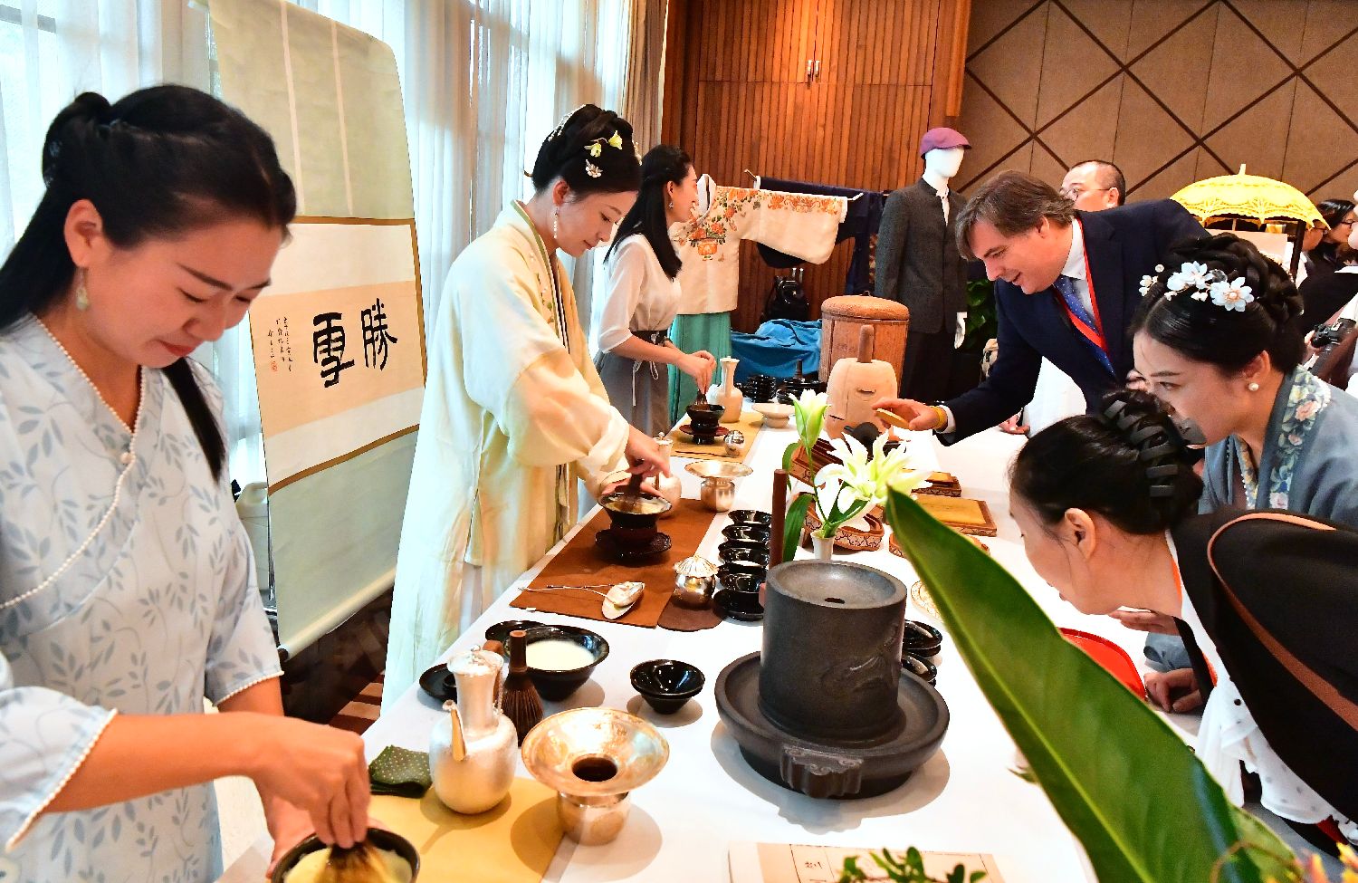 在非物质文化遗产项目展示区域,参会的嘉宾27日在了解建州宋式点茶。(图片来源:中新社)