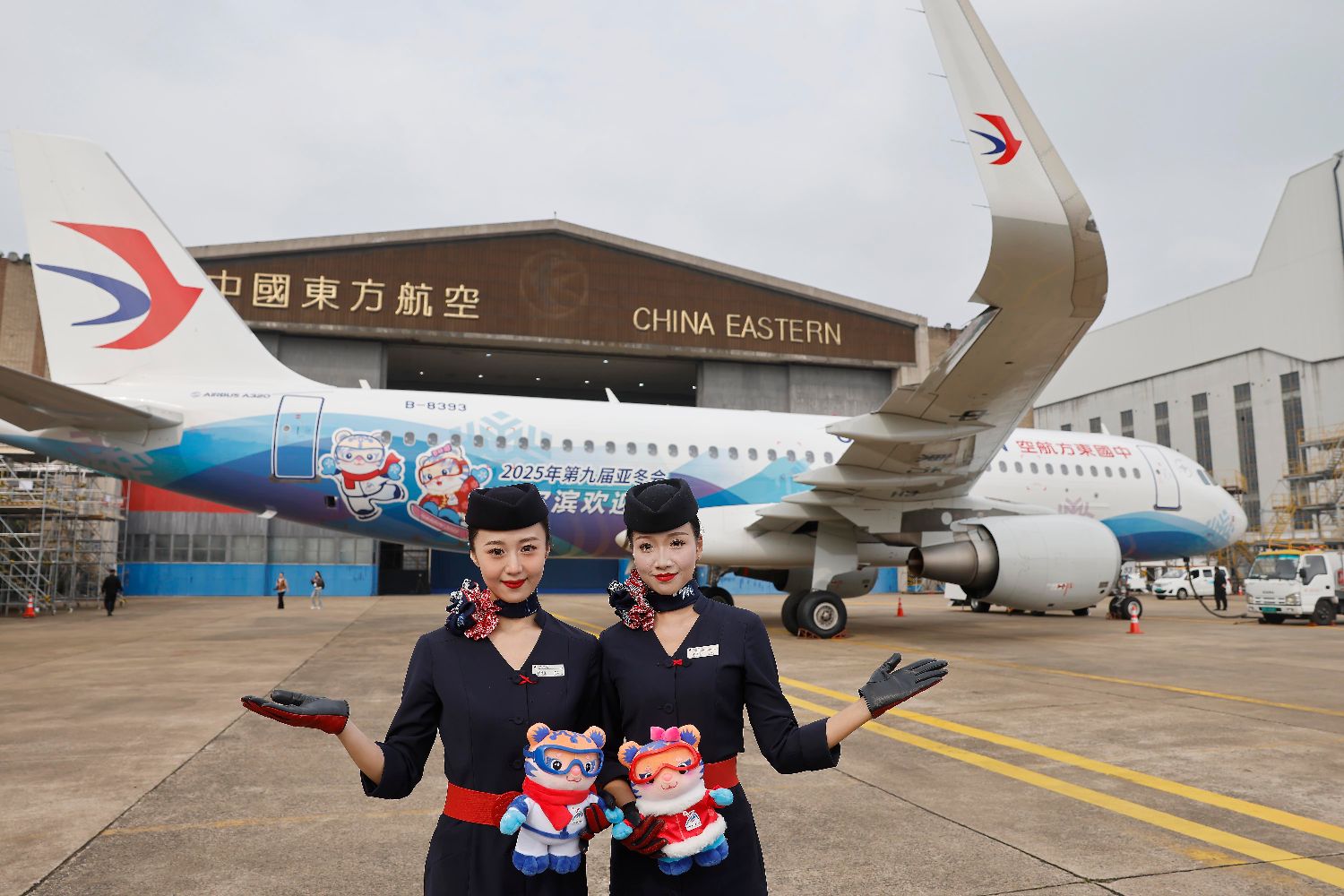 哈尔滨2025年第九届亚冬会吉祥物“滨滨”和“妮妮”与首架“亚冬号”主题彩绘机合影。(图片来源:中新社)