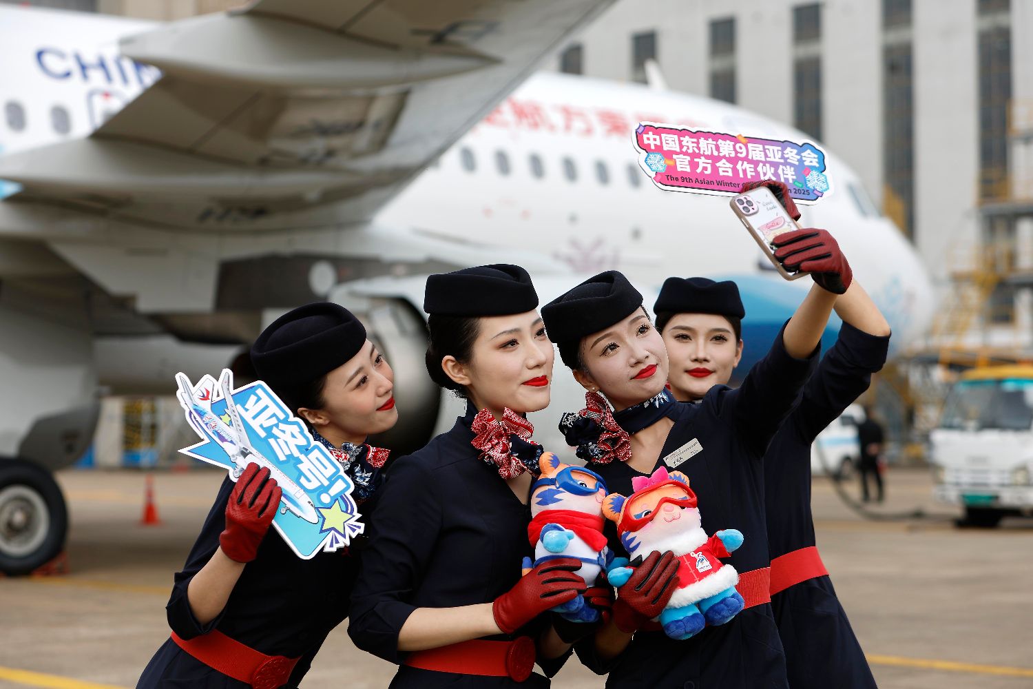 乘务员与首架“亚冬号”主题彩绘机自拍合影。(图片来源:中新社)