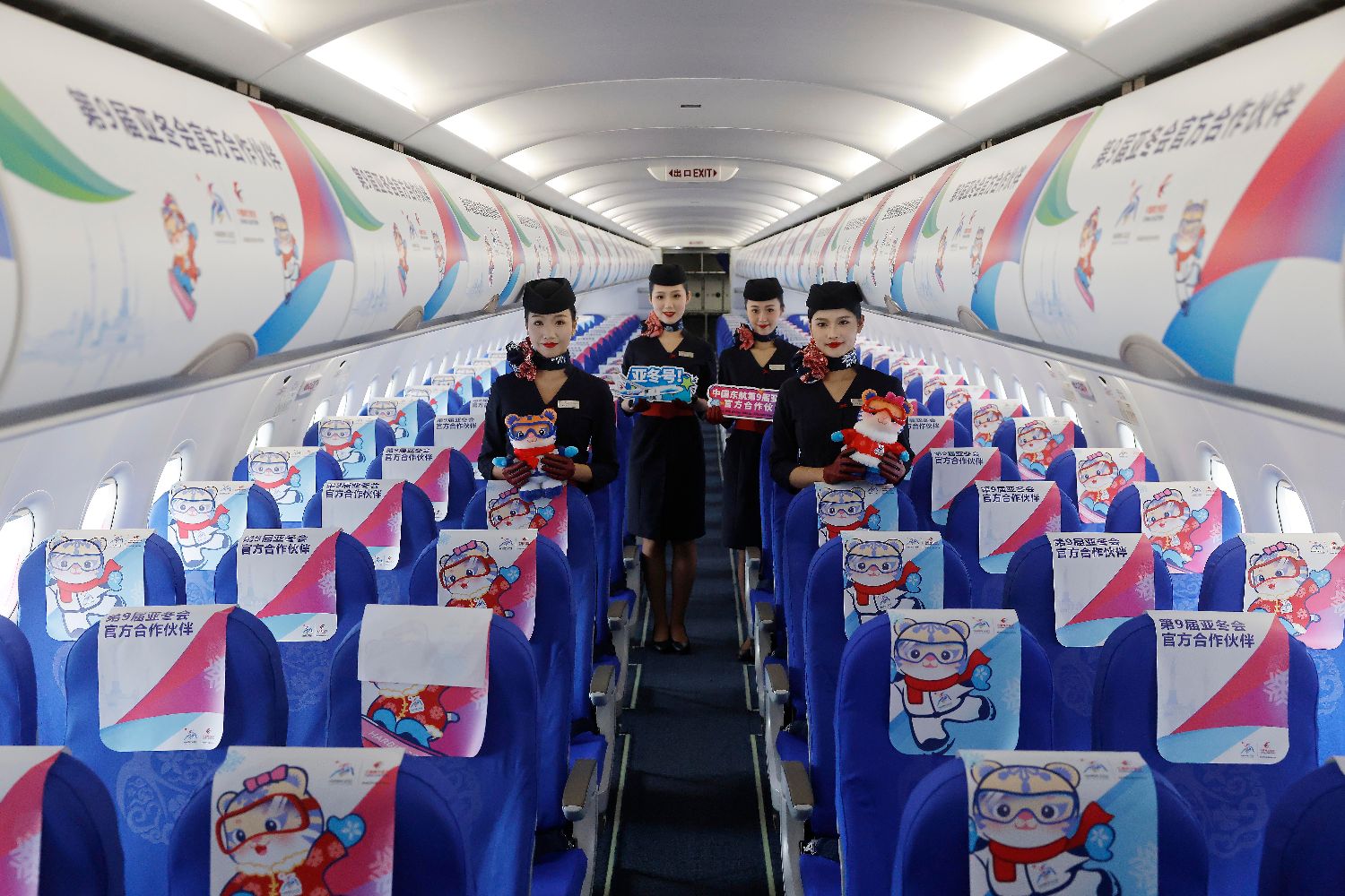 彩绘机客舱内部,同样呈现着浓郁的亚冬元素和冰雪风格。小桌板、头片等均饰有亚冬会的会徽、吉祥物,飞机舷窗则巧妙贴上了冰雪造型的“窗花”。图为乘务员在首架“亚冬号”主题彩绘机内合影。(图片来源:中新社)