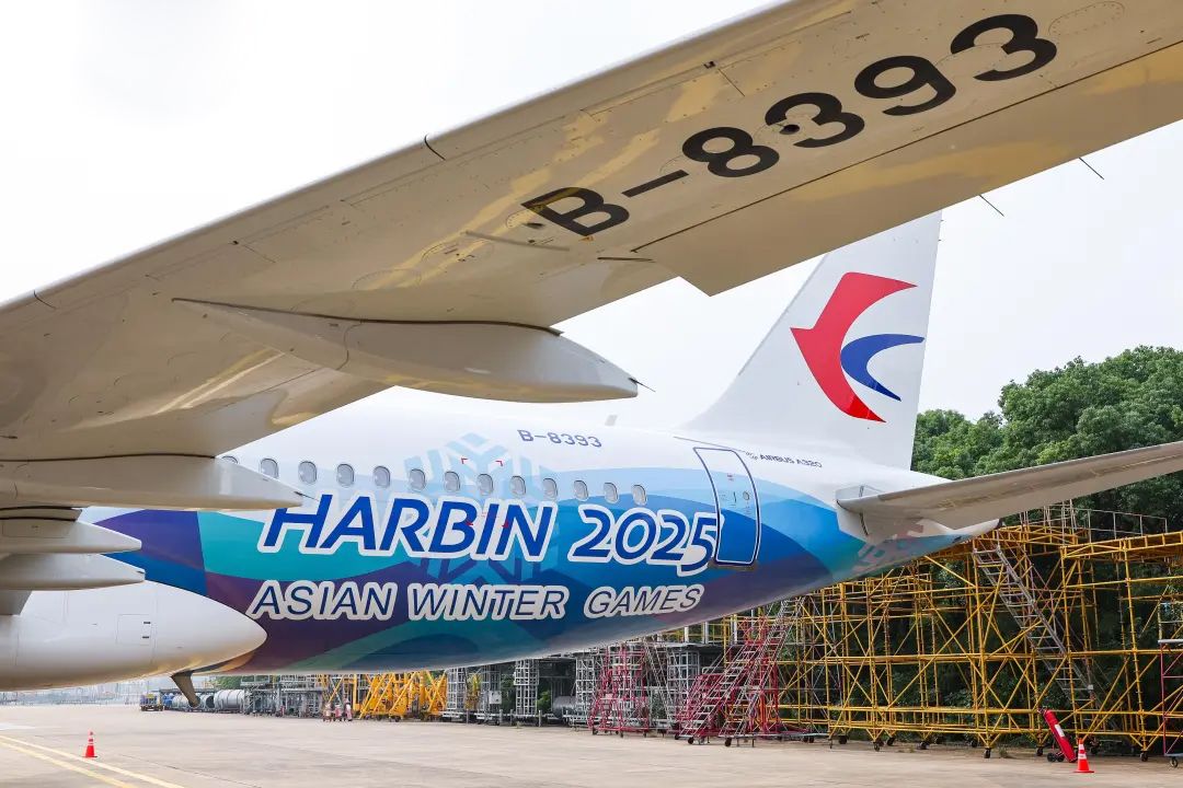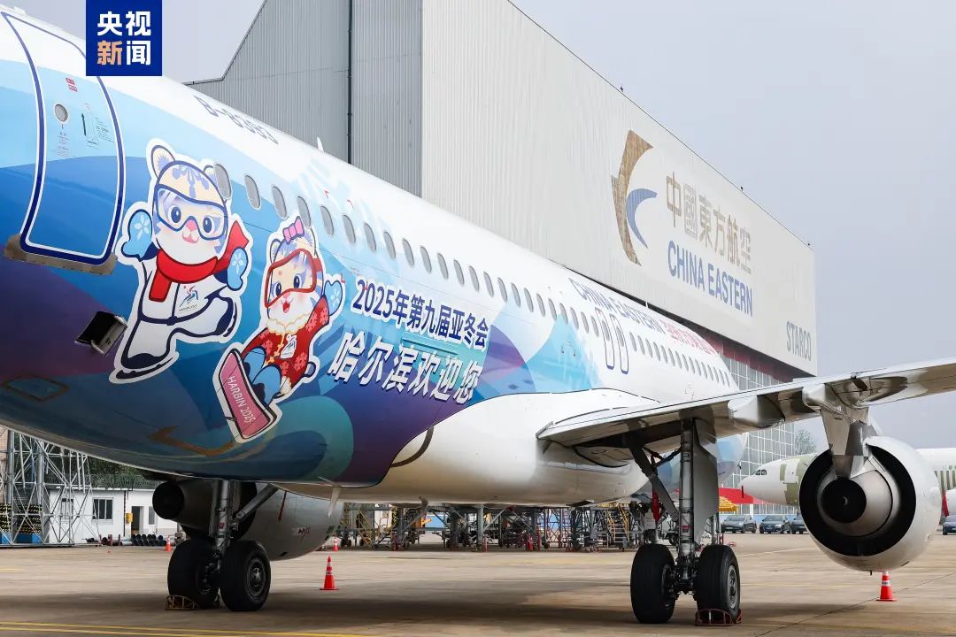 第2架彩绘机选用了宽体机型空客A330-200,机身长度58.8米、翼展60.3米,具有国际远程飞行能力,向全球旅客发出“亚冬会之约”。图为首架“亚冬号”主题彩绘机。(图片来源:大陆央视新闻客户端)