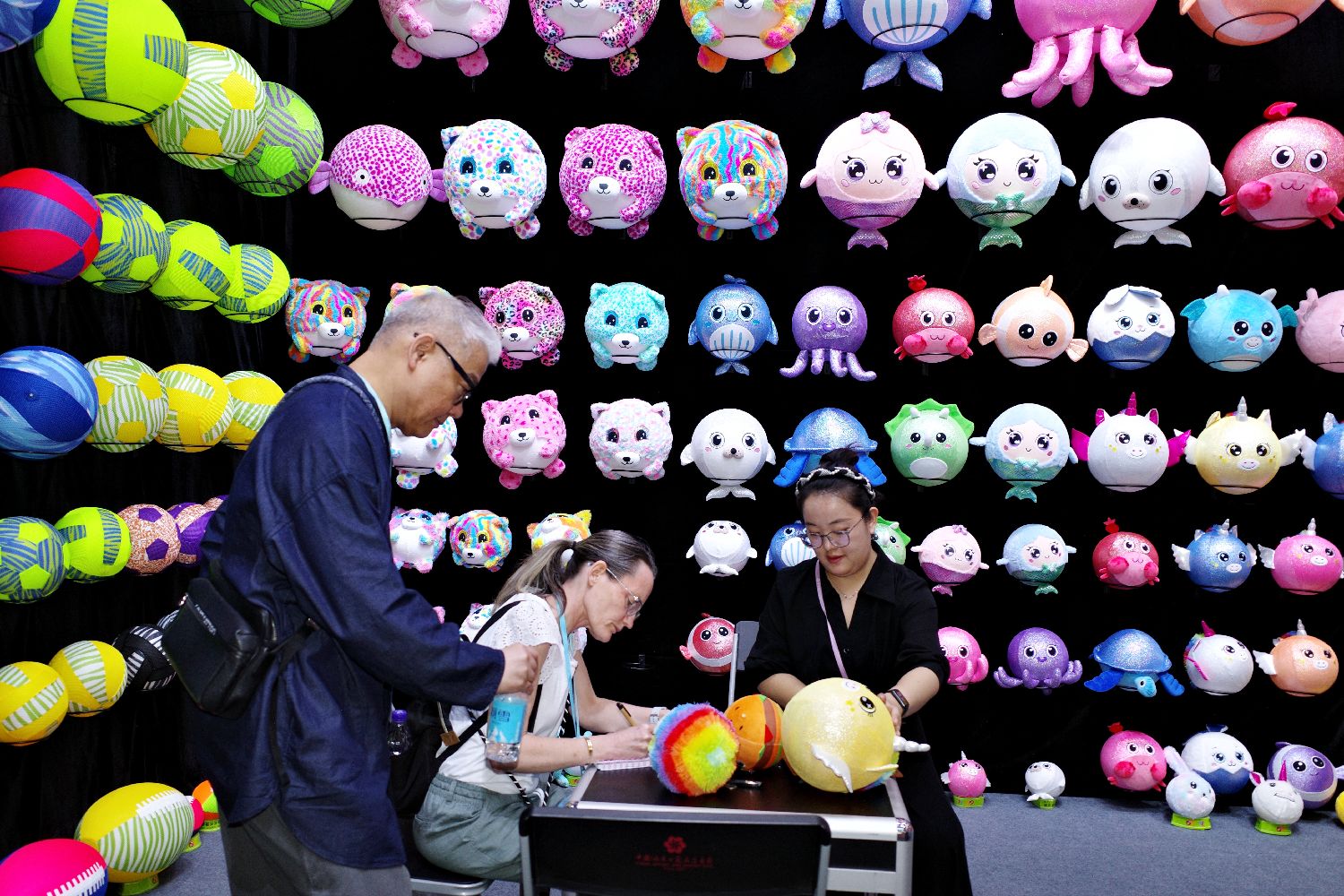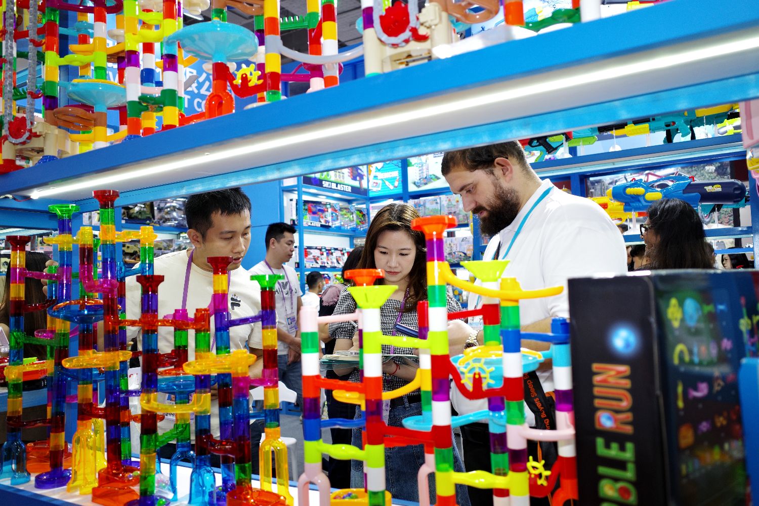 据介绍,第三期企业通过挖掘更深层次的消费需求,在孕婴童、服饰、文具、食品、宠物用品、健康休闲等领域推出了更细分、更高品质的产品,打造美好生活体验,助力提升生活品质。图为第136届广交会第三期的玩具展位吸引采购商参观。(图片来源:中新社)