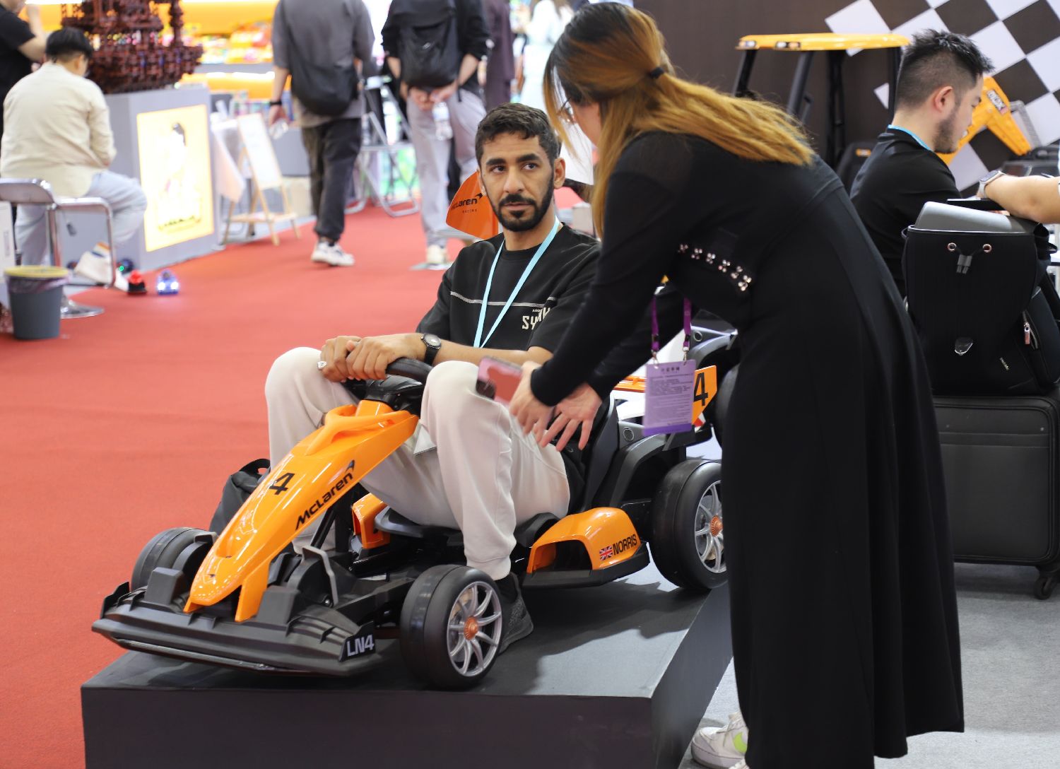 采购商体验儿童电动遥控车。(图片来源:北京人民网)