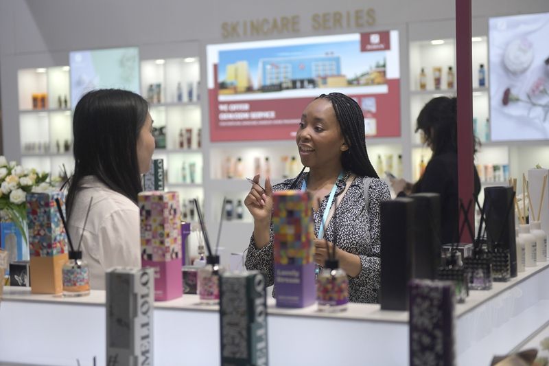 客商10月31日在广交会上参观选购香薰产品。(图片来源:新华社)