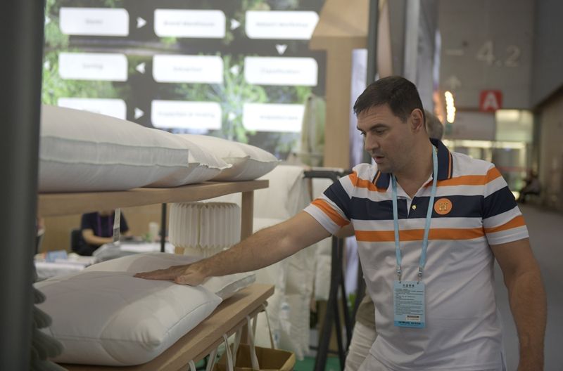 客商在广交会上参观选购床上用品。(图片来源:新华社)