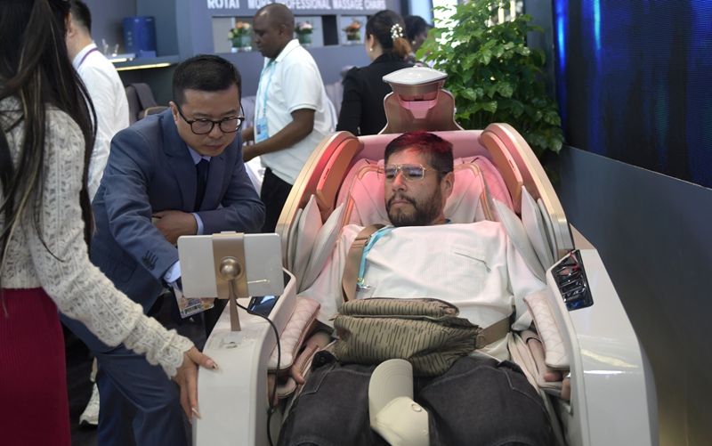 客商10月31日在广交会上体验按摩椅。(图片来源:新华社)