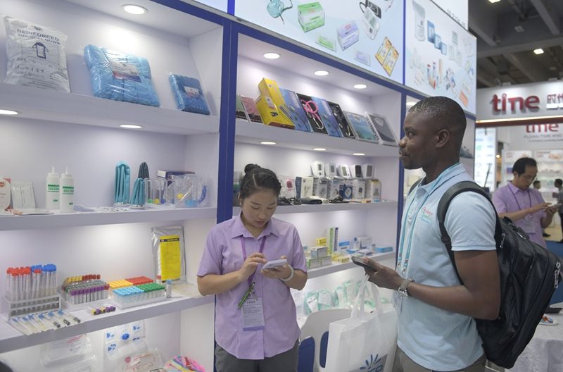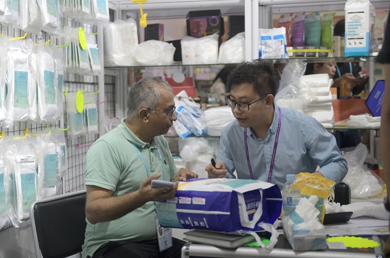 客商10月31日在广交会上参观选购卫生用品。(图片来源:新华社)