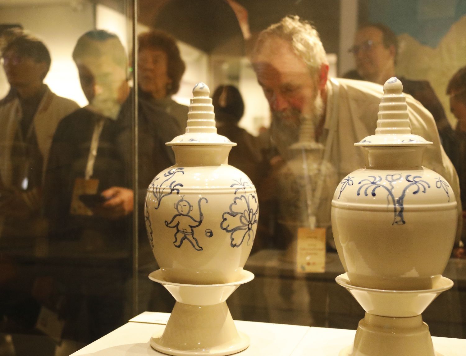 外籍专家学者在郑州市文物考古研究院考古博物馆参观塔式青花瓷罐。(图片来源:中新社)