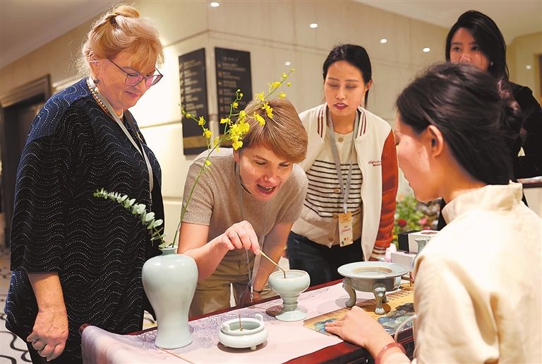 外籍专家学者饶有兴趣地感受中国非遗文化。(图片来源:《河南日报》客户端)