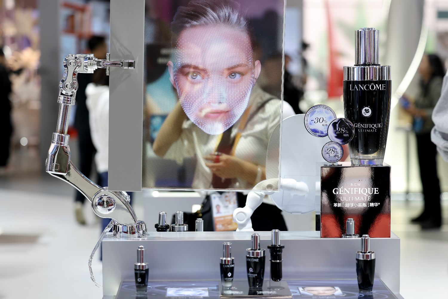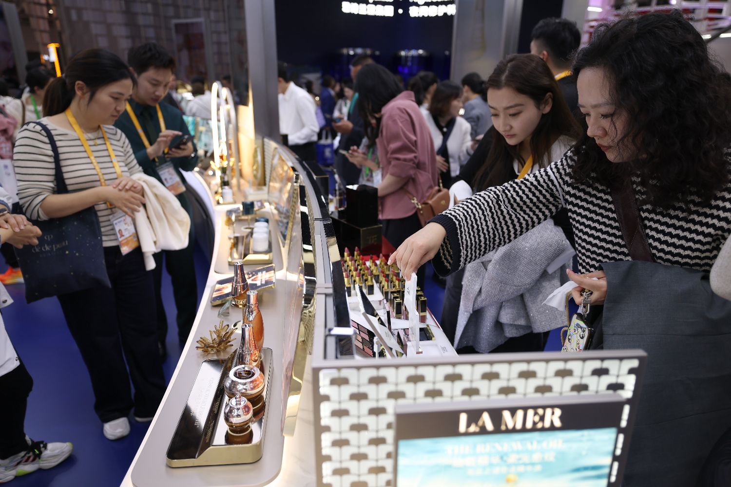 据了解,本届进博会国家展为各国展示综合形象和拓展贸易投资领域机遇搭建重要平台。图为6日,消费品展区雅诗兰黛展位吸引参观者。(图片来源:中新社)