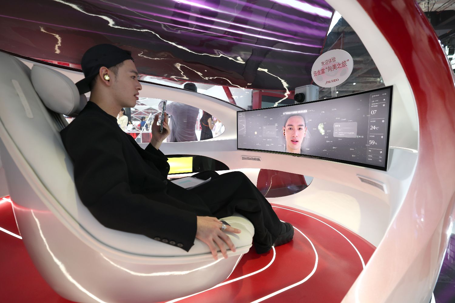 参观者6日在消费品展区资生堂展位“美时美刻”体验舱检测肤质。(图片来源:中新社)