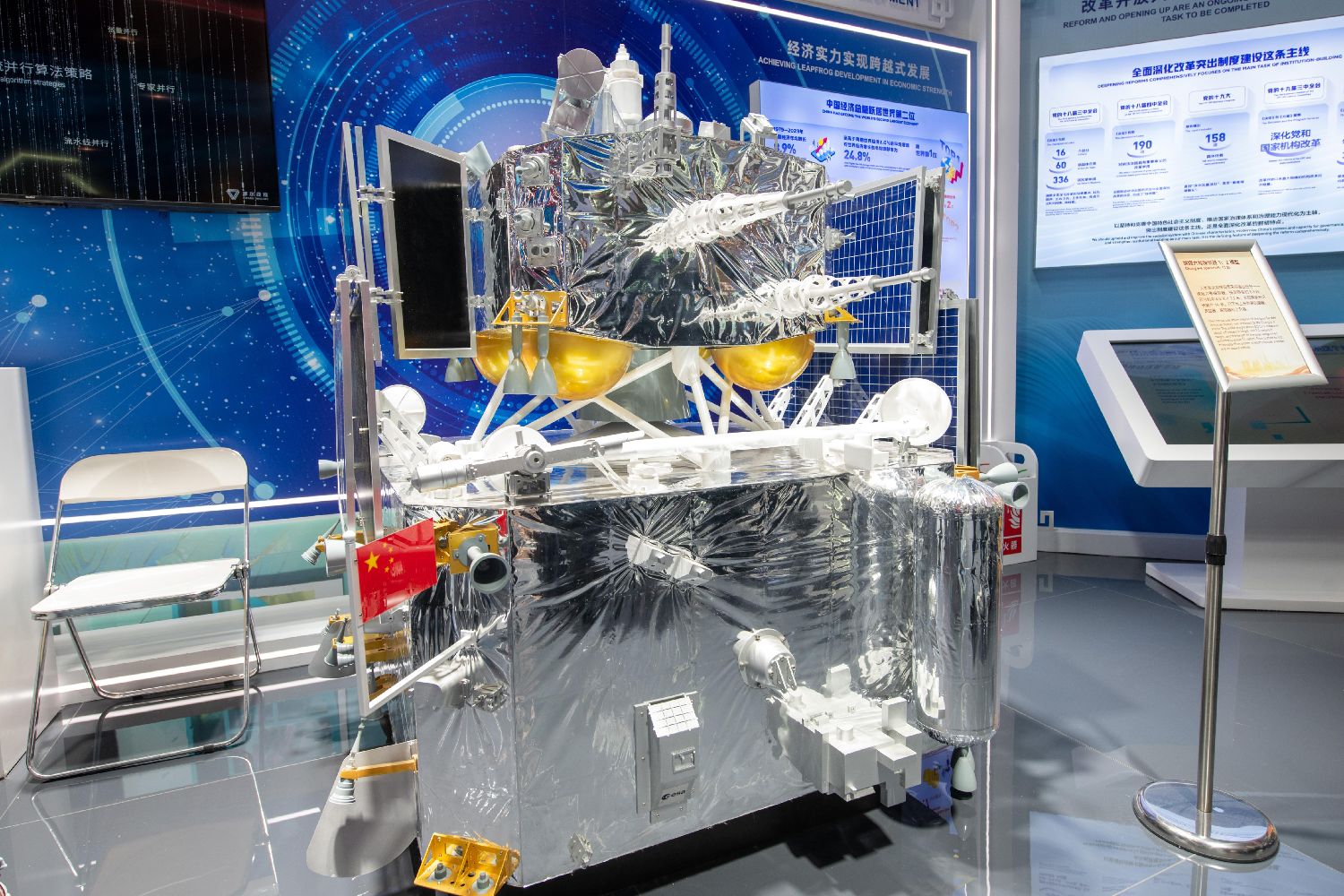 在第七届进博会中国馆展出的嫦娥六号探测器模型。(图片来源:北京人民网)
