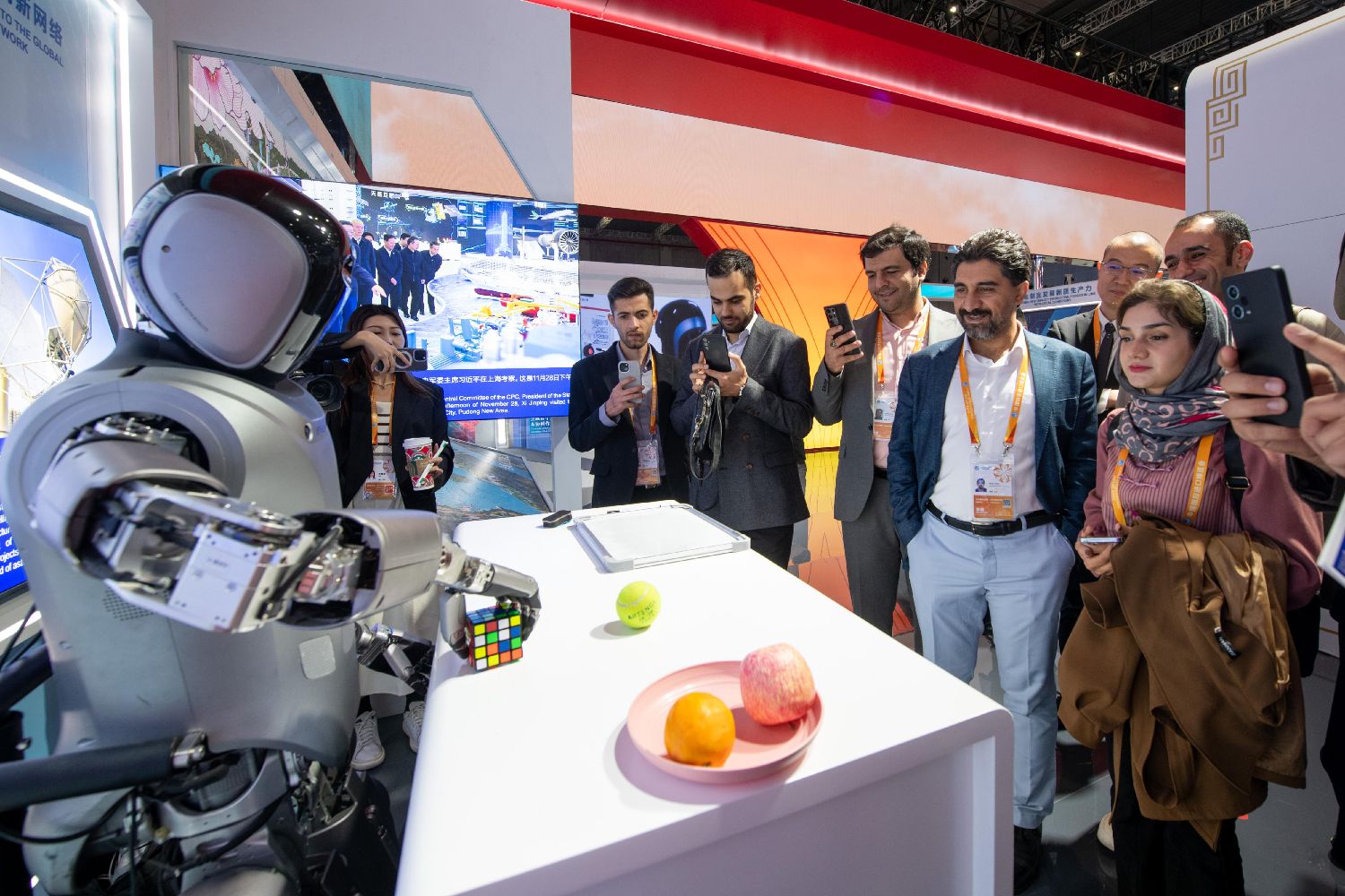 中国馆以“推进中国式现代化,共谋世界发展繁荣”为主题,重点展示推进中国式现代化建设和推动高水平对外开放的最新成果,展现中国加快培育和发展新质生产力的崭新气象。图为在第七届进博会中国馆,人形机器人6日吸引众多参观者目光。(图片来源:北京人民网)