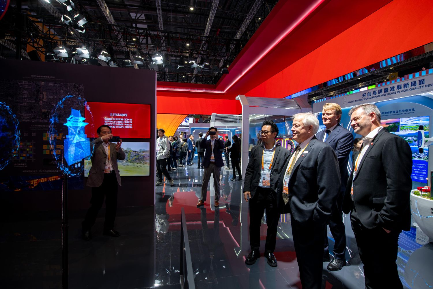 在第七届进博会中国馆,外国参展商6日对现代艺术装置展现的北京中轴线非常感兴趣。(图片来源:北京人民网)
