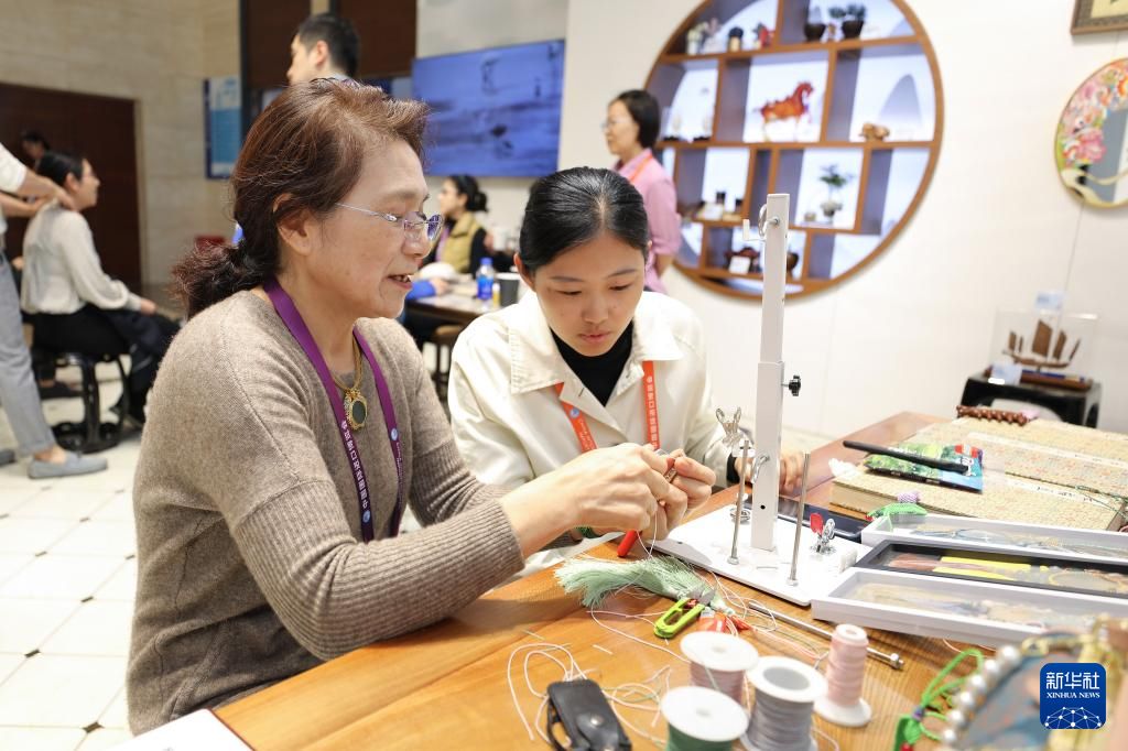 手工艺人(左)6日在第七届进博会新闻中心的“上海非遗客厅”向记者介绍同心结的制作方法。(图片来源:新华社)