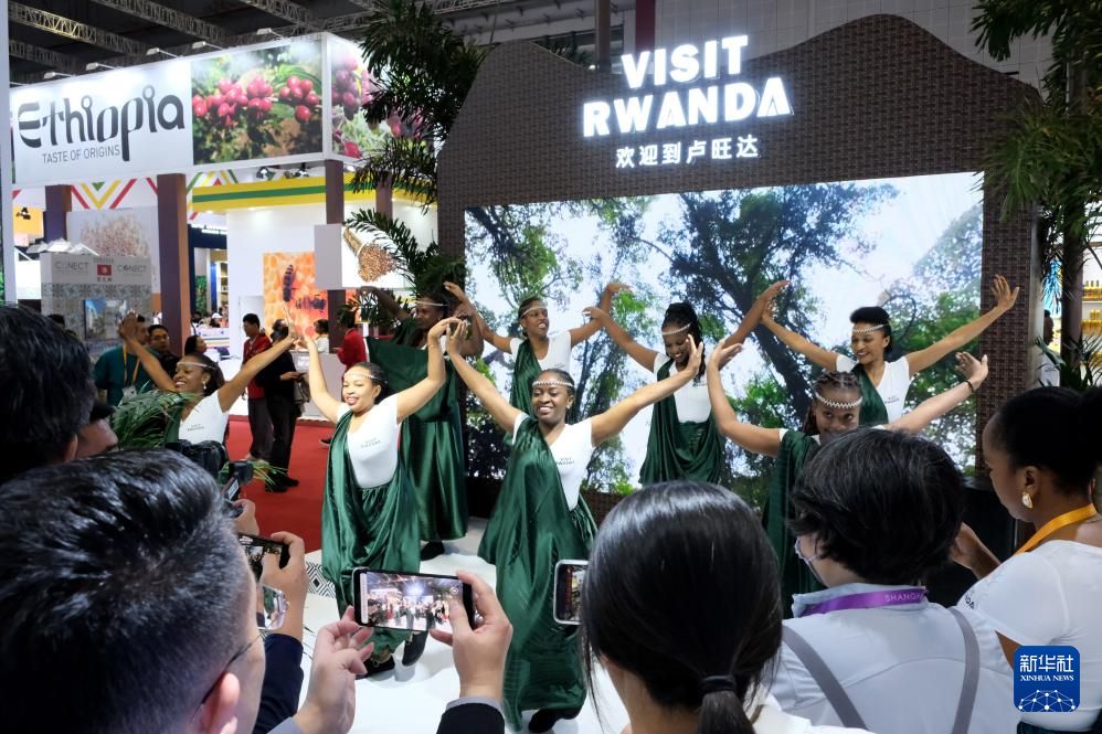 表演者6日在第七届进博会国家综合展卢旺达展馆表演舞蹈。(图片来源:新华社)