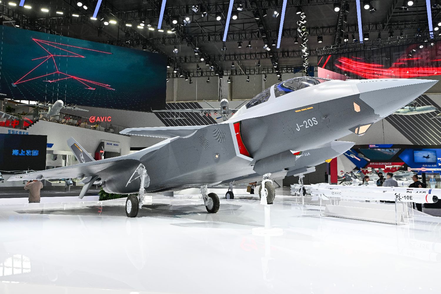据介绍,与以往不同,本届航展首次开辟无人机、无人船第二展区,该展区总面积约为33万平方米,包含静态展示区、动态演示区以及综合馆等,将于11月12日至14日期间,每天安排4小时无人机、水上无人装备表演。图为“J-20S”模型。(图片来源:中新社)