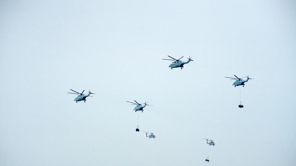中国人民海军舰载直升机10日在广东珠海开展适应性飞行训练。图为海军舰载直升机编队10日在广东珠海进行适应性飞行训练。(图片来源:新华社)