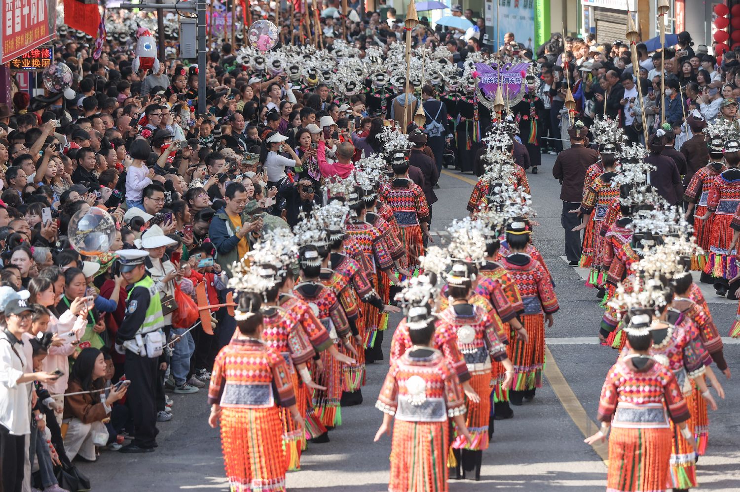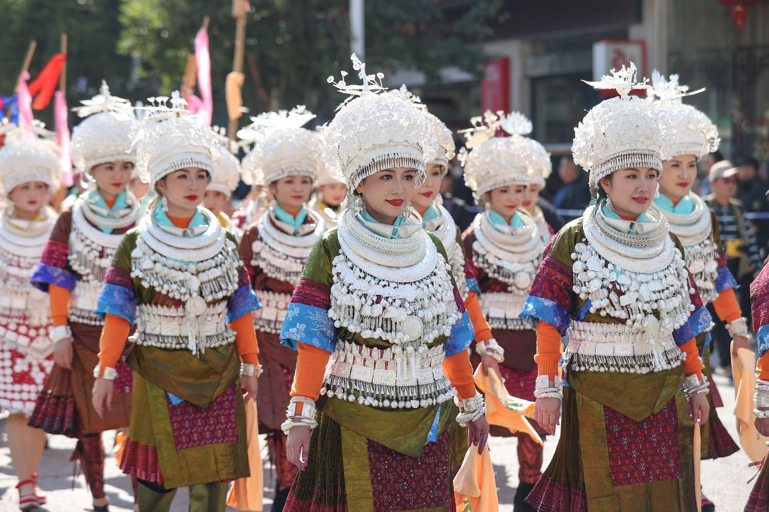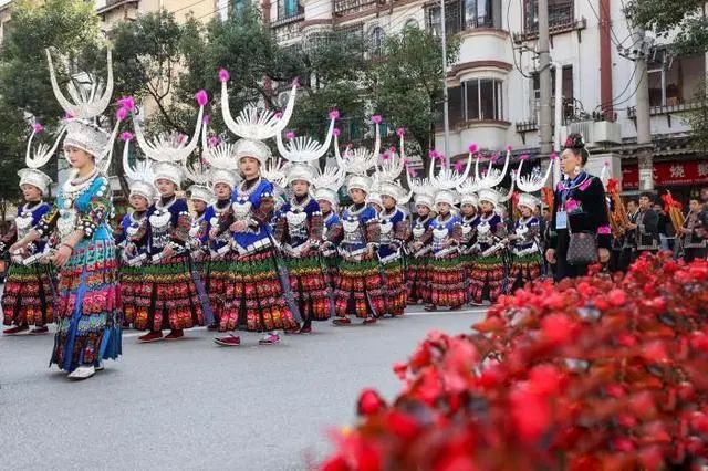 苗族民众穿着节日盛装参加巡游。