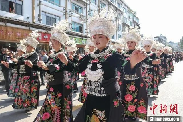 2024中国·雷山苗年暨鼓藏节万人非遗巡游10日在贵州省黔东南苗族侗族自治州雷山县举行。