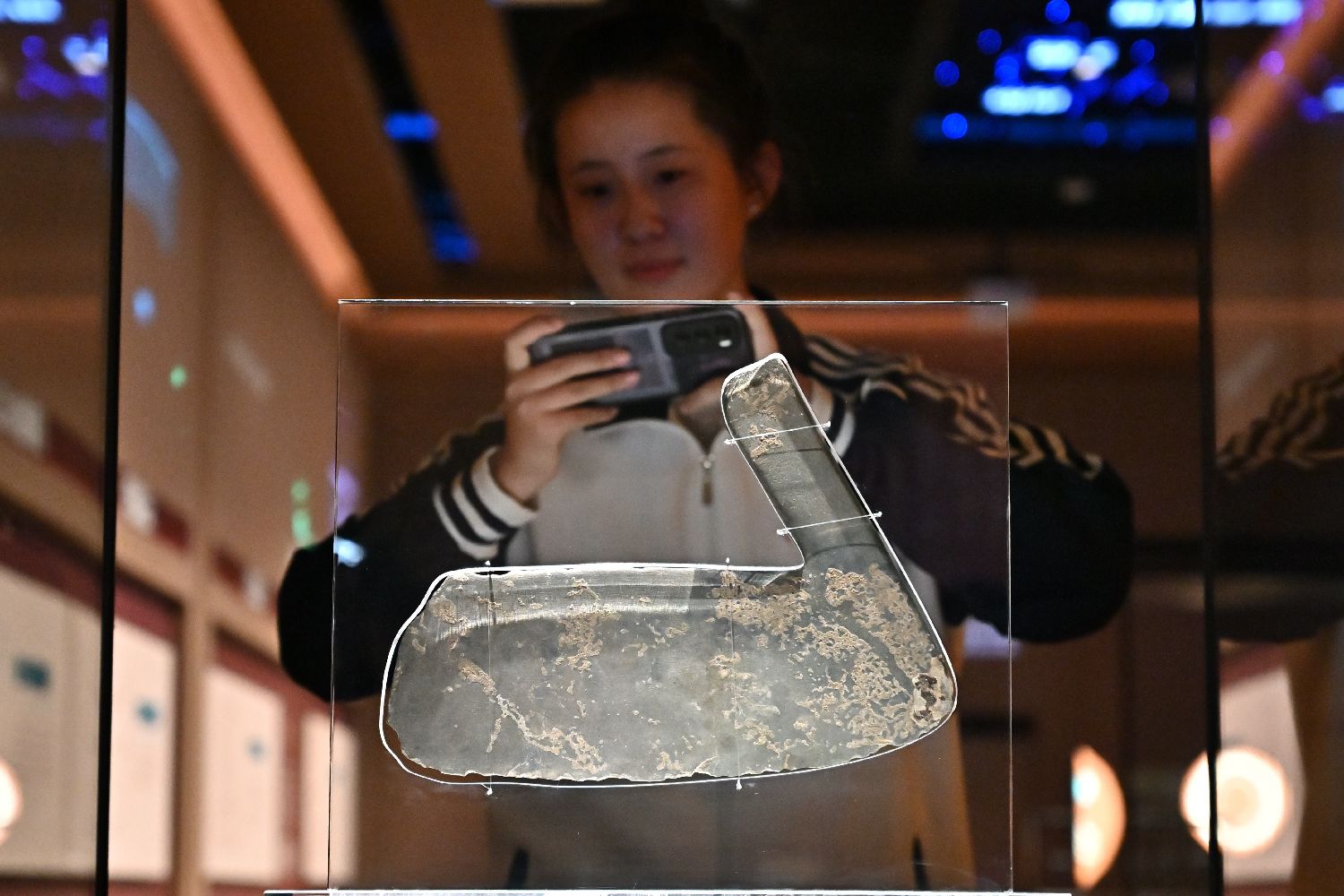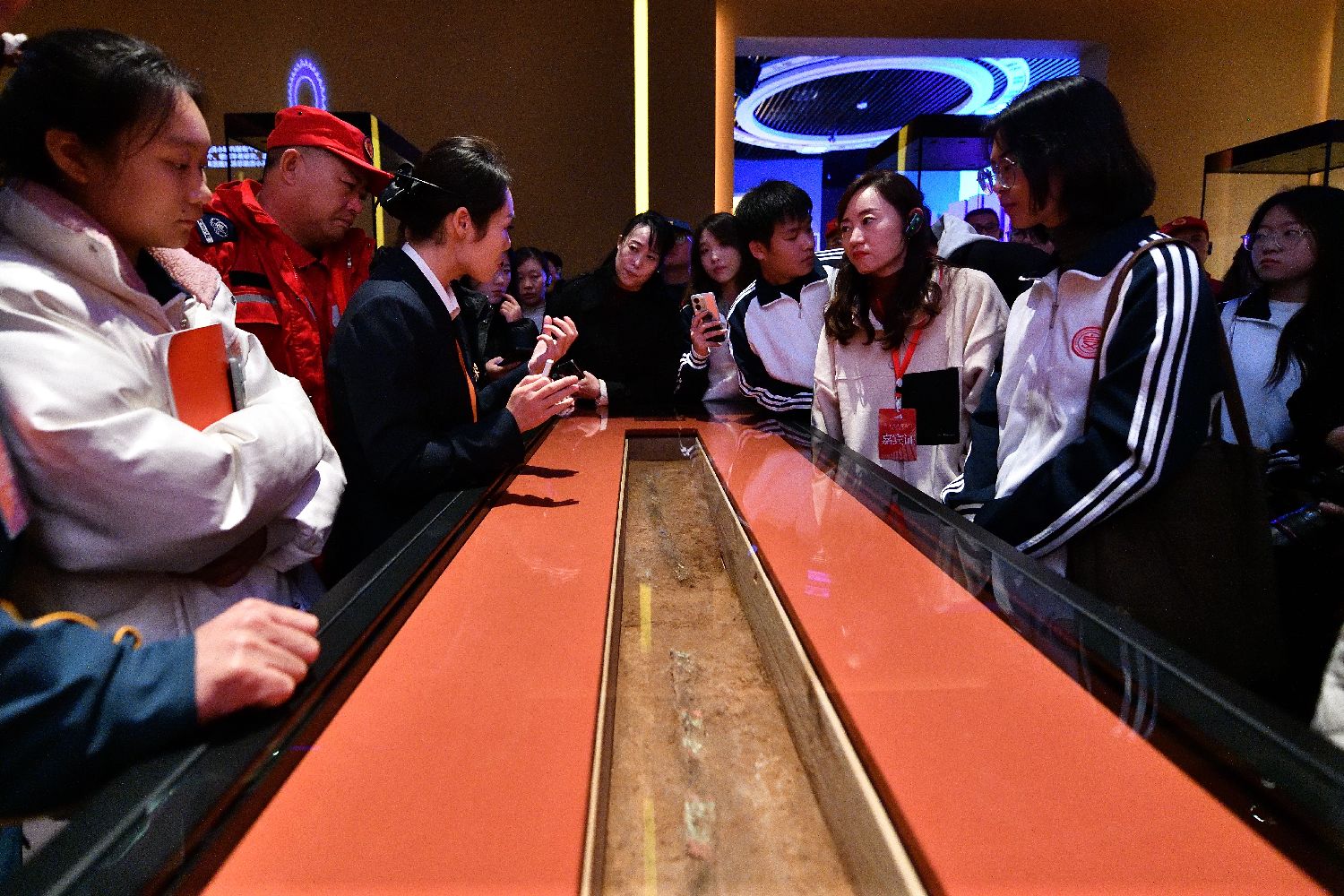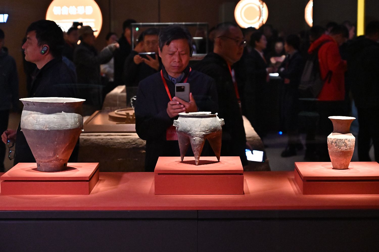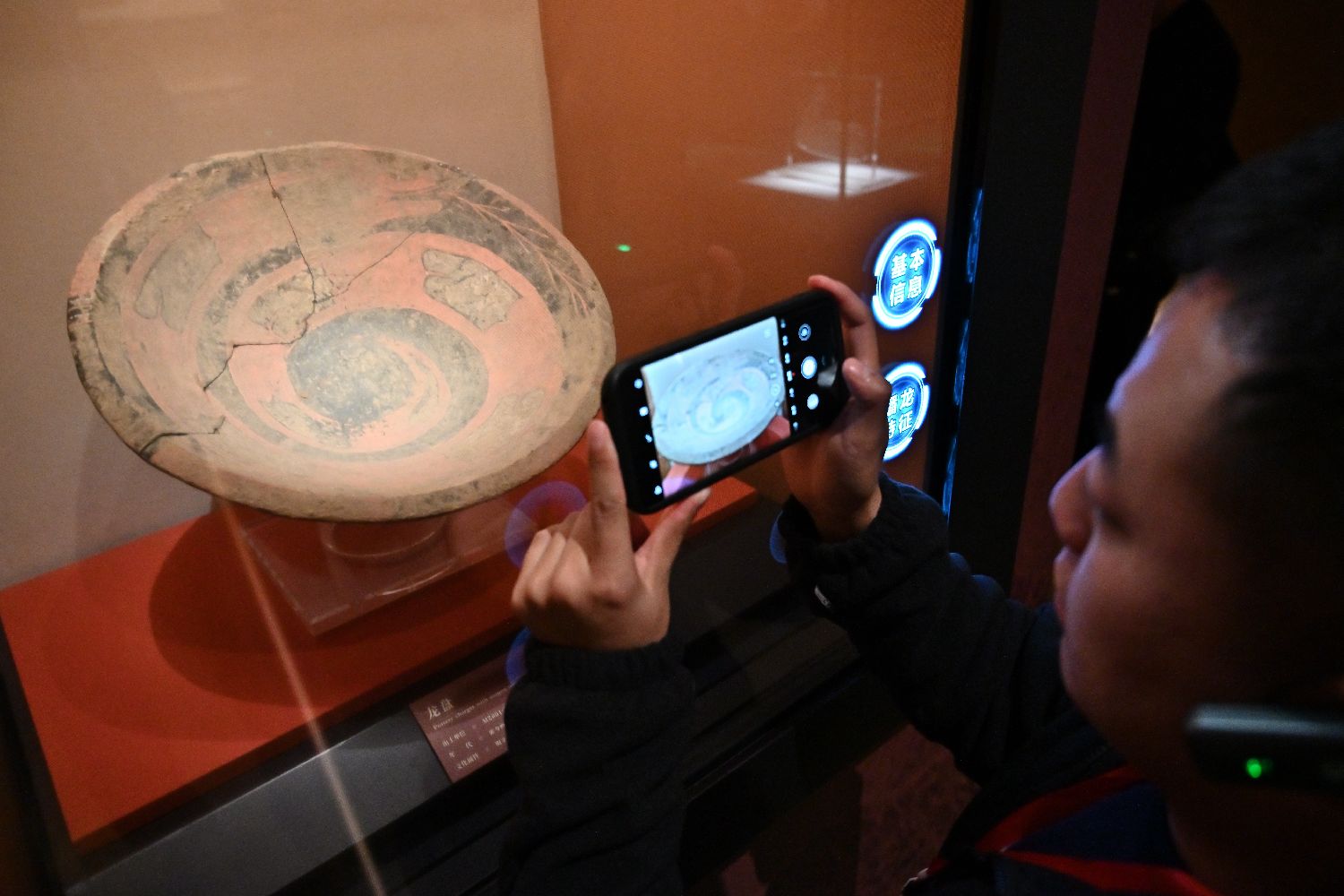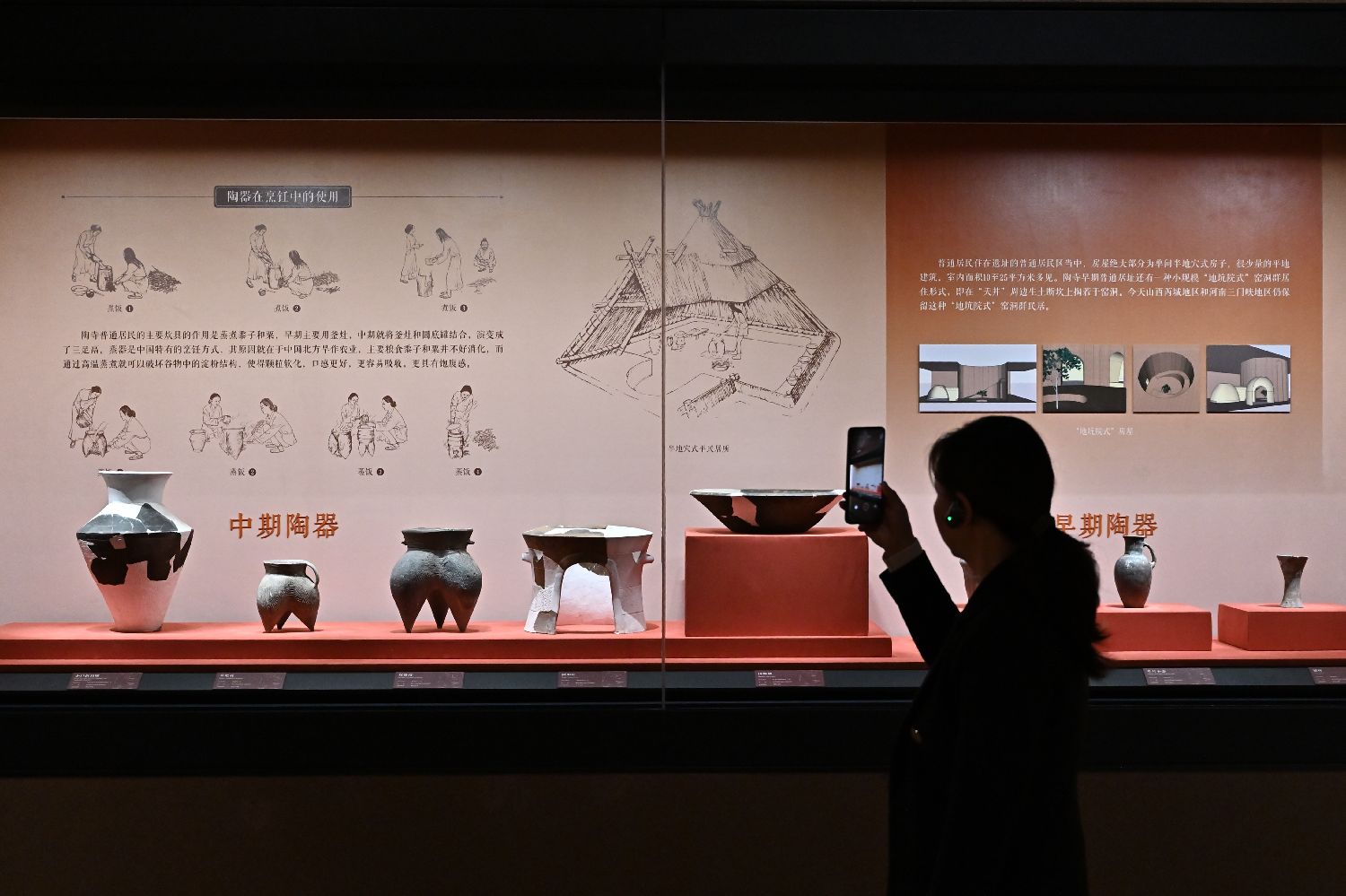 展馆里,观象台、圭表、铜齿轮形器、沙漏……部分学者推测,陶寺先民们已能推算节气、制定历法精准管理时间,初步形成了一套“年月日时”完整计时系统。图为游客在陶寺遗址博物馆拍照。(图片来源:新华社)