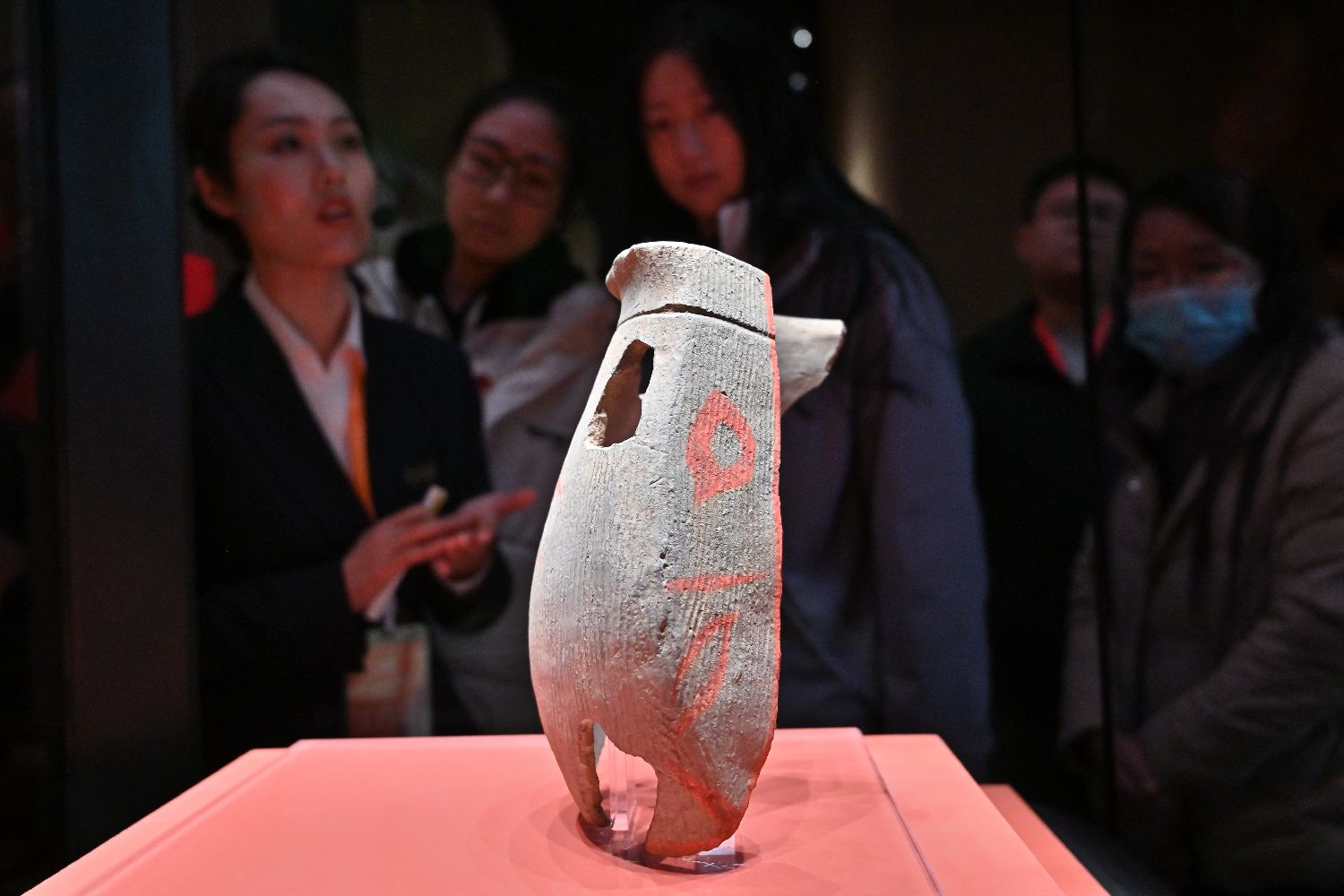 民众参观陶寺遗址博物馆馆藏文物——文尧陶扁壶。(图片来源:中新社)