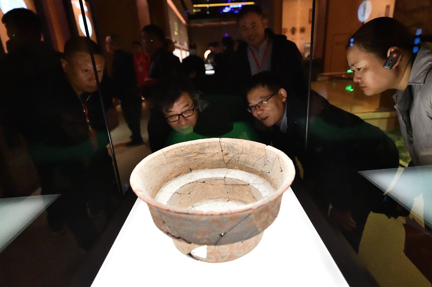 民众参观陶寺遗址博物馆馆藏文物——折腹彩绘陶盘。(图片来源:中新社)