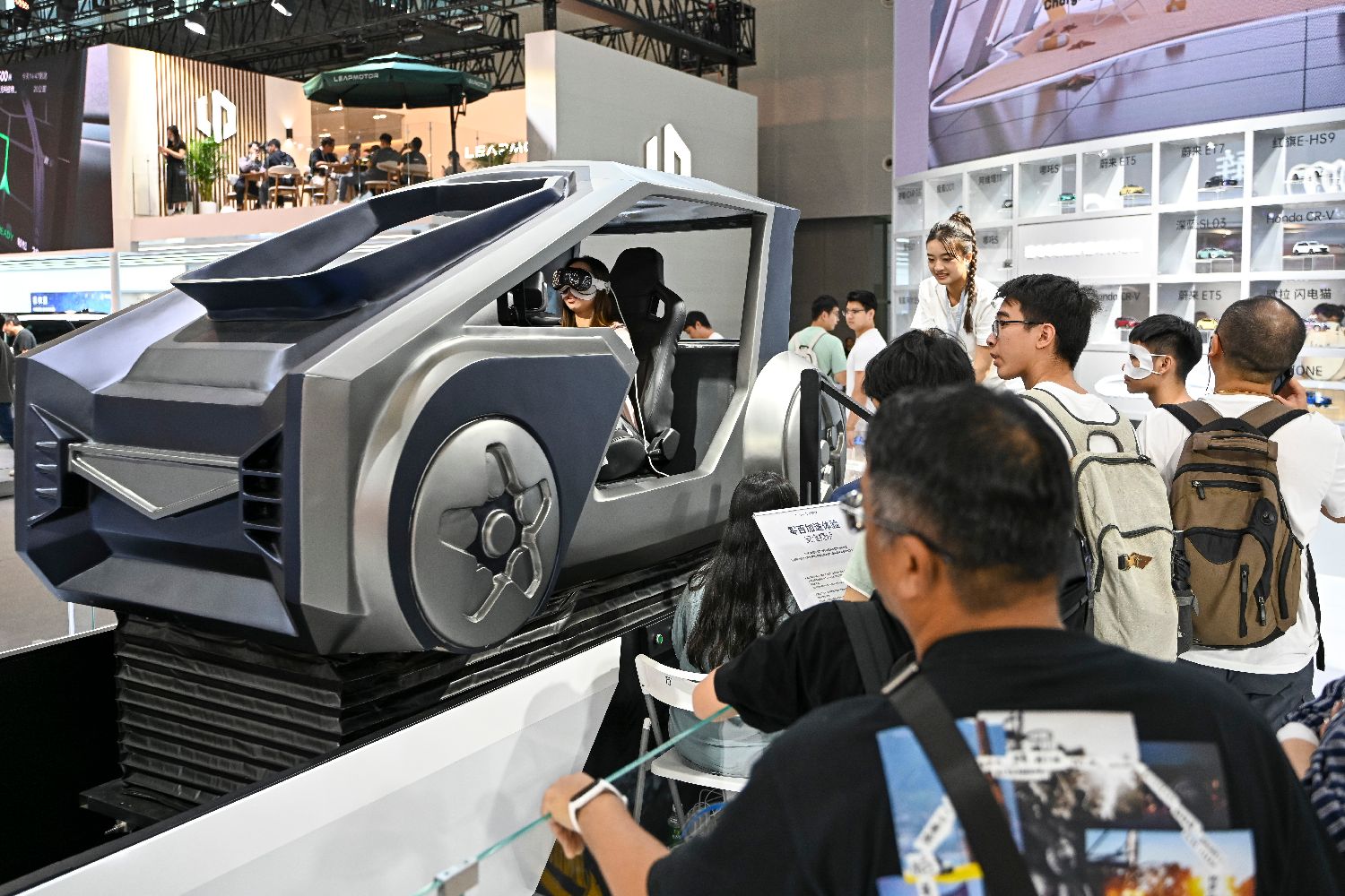 参观者17日在宁德时代展位体验“零百加速”模拟器。(图片来源:中新社)