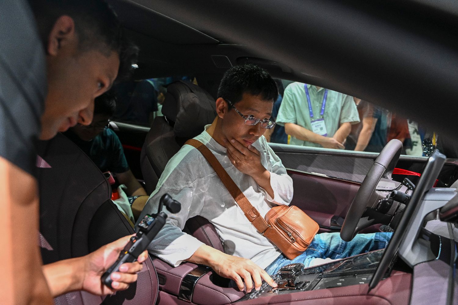 参观者17日在一款腾势新能源车内体验。(图片来源:中新社)