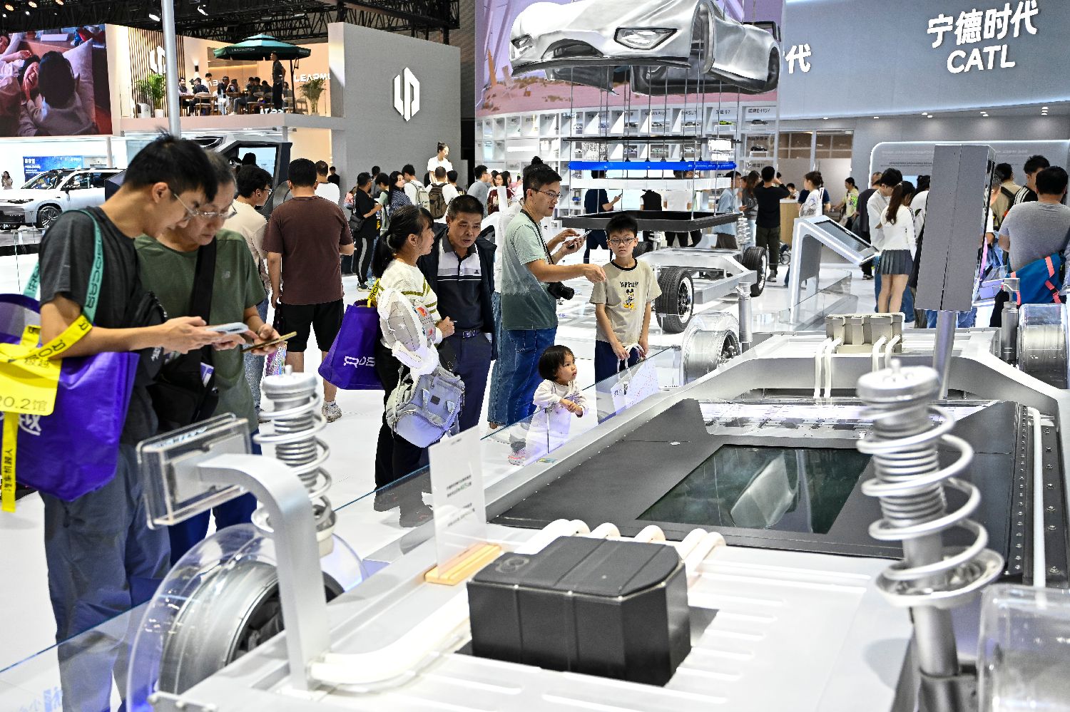 宁德时代展位中的麒麟电池结构模型17日吸引参观者。(图片来源:中新社)