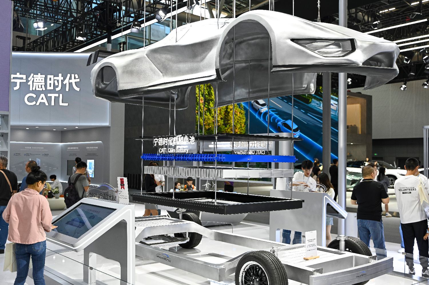 宁德时代展位中的神行超充电池结构模型17日吸引参观者。(图片来源:中新社)