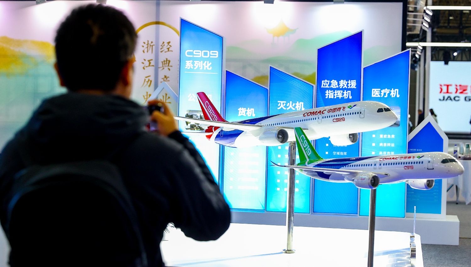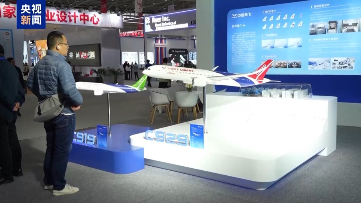 观众在中国商飞C919和C929飞机模型前驻足观看。(图片来源:大陆央视新闻客户端)