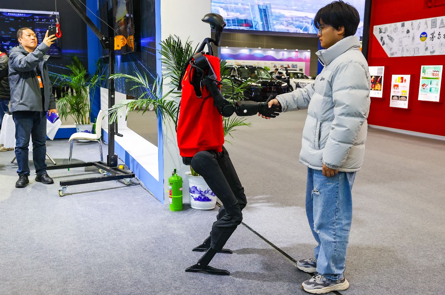 博览会上人形机器人20日与一位观众亲切握手。(图片来源:中新社)