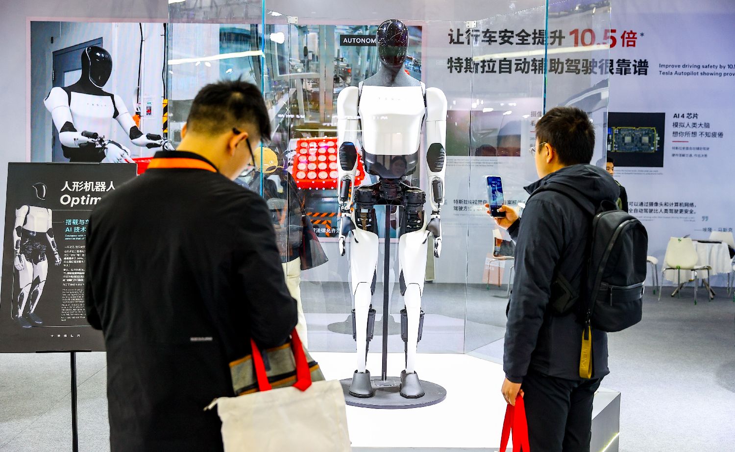 特斯拉20日展台展示的人形机器人吸引观众拍照。当日,以“设计驱动未来创新赋能发展”为主题的第七届中国国际工业设计博览会在武汉国际博览中心开幕。(图片来源:中新社)