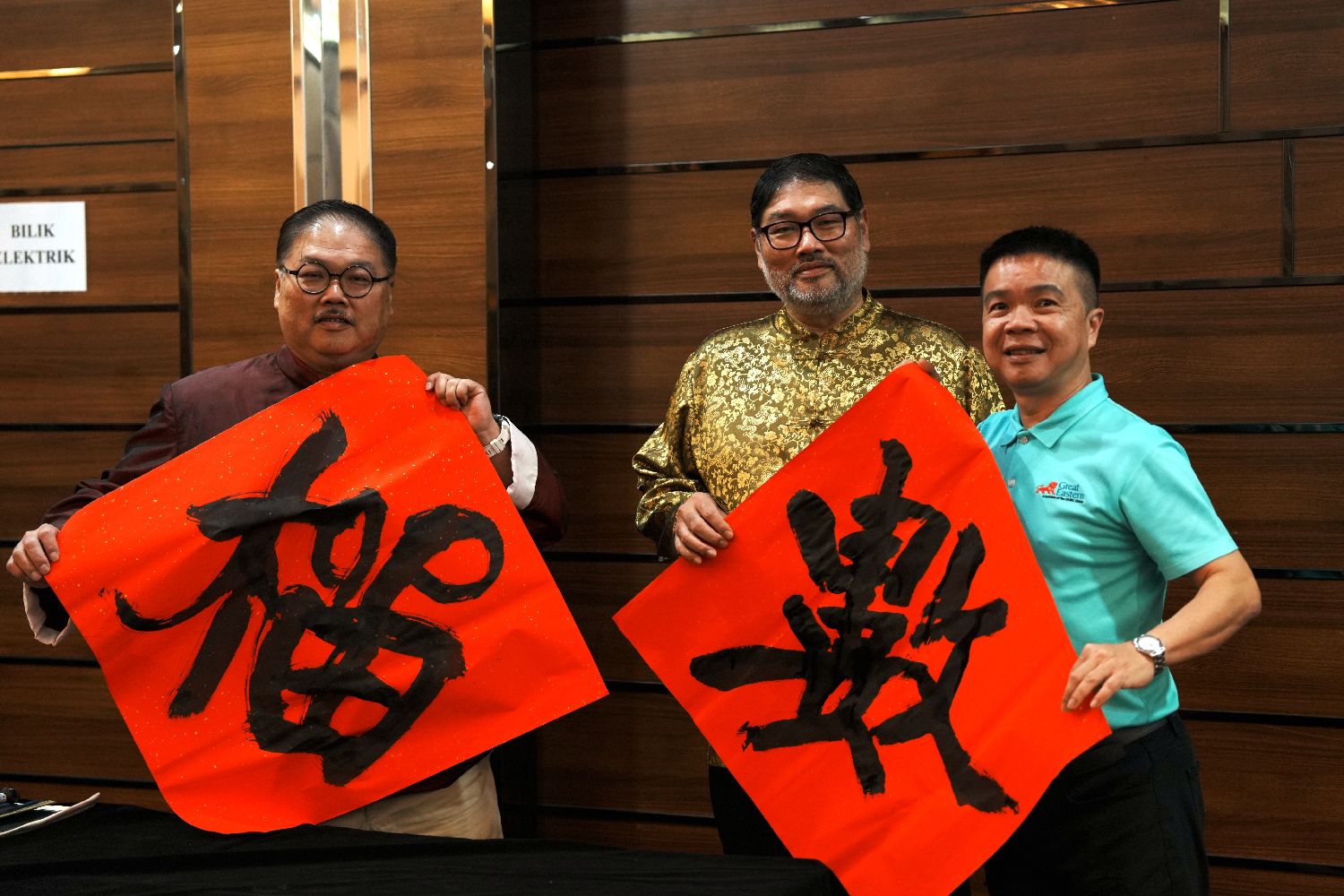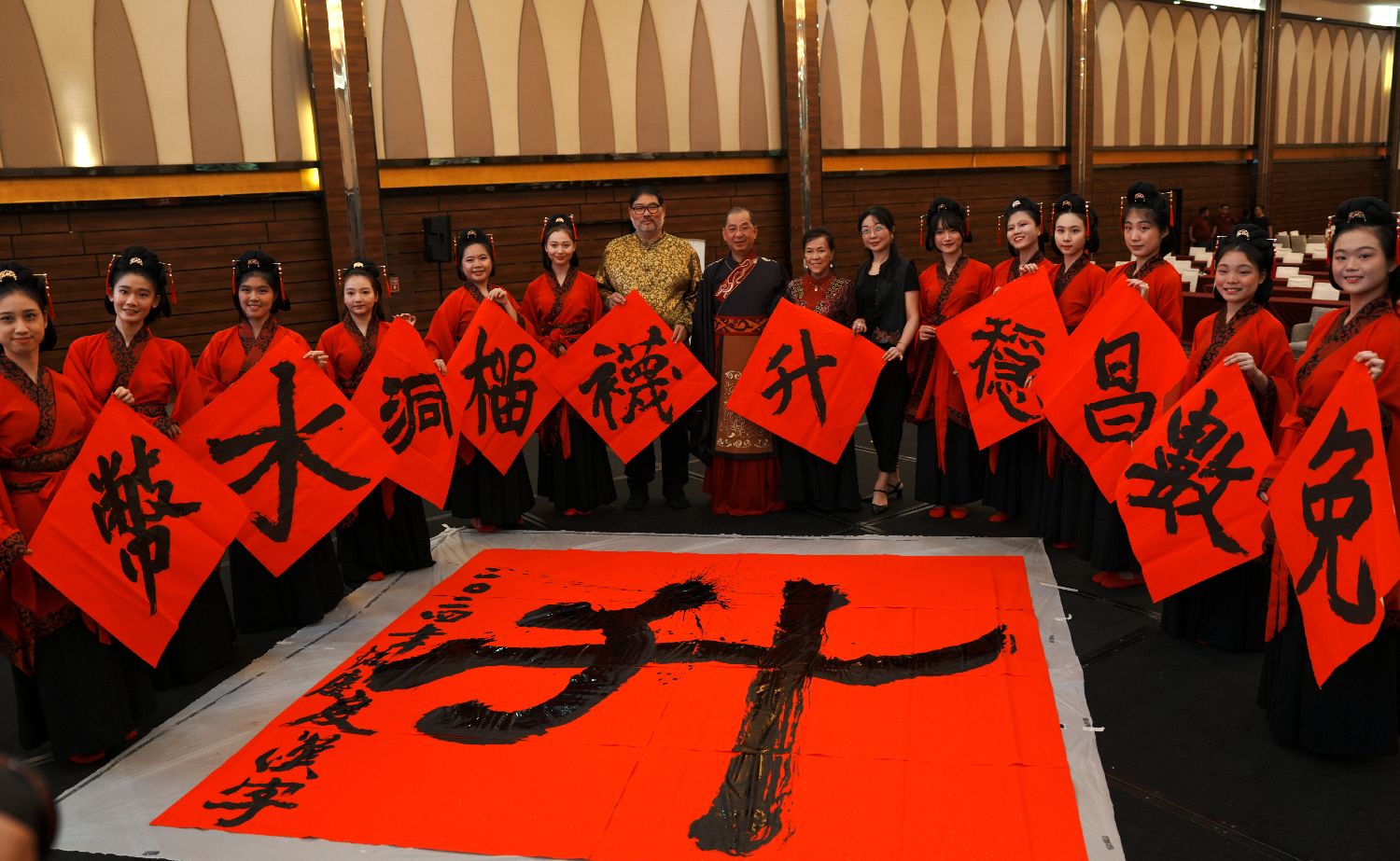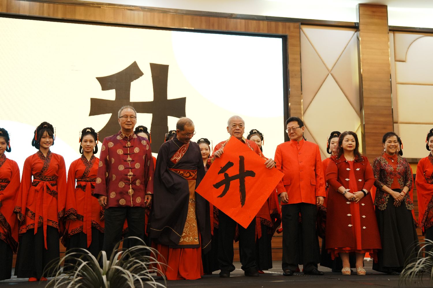 当地时间12月15日,“马来西亚2024年度汉字”在雪兰莪州莎阿南市揭晓,“升”字中选。图为马来西亚中华大会堂总会总会长吴添泉(最前排右二)揭晓年度汉字。