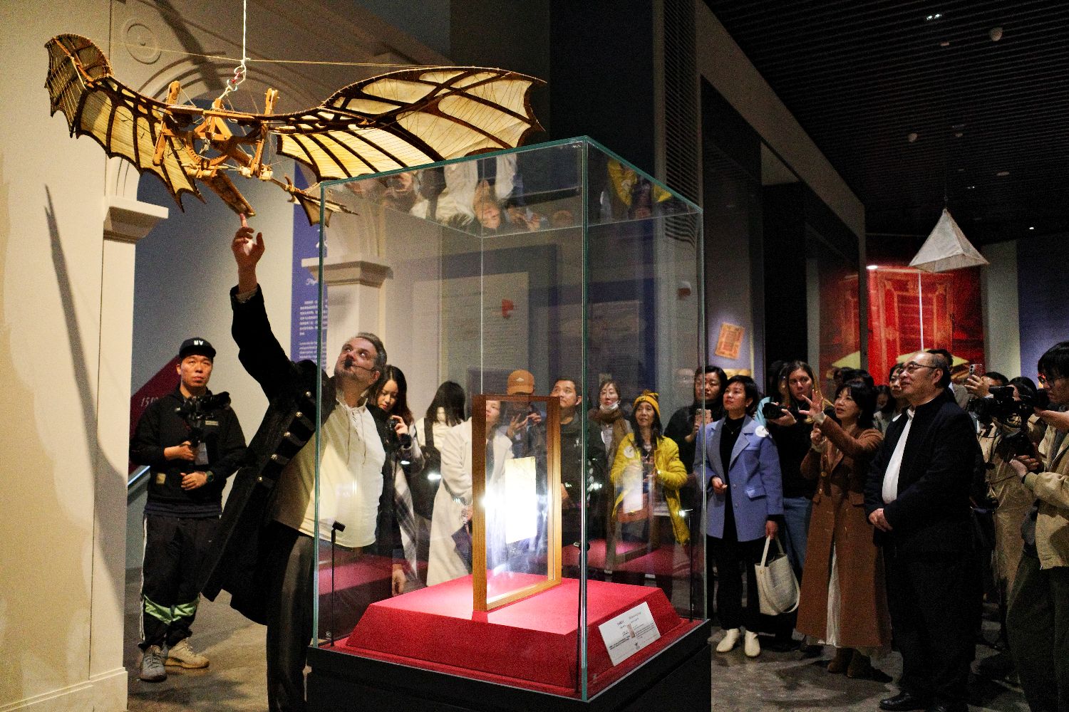意大利达芬奇学院创办人、首席策展人马里奥·塔代伊(左二)为参观者介绍达芬奇创作飞行器的细节。(图片来源:中新社)