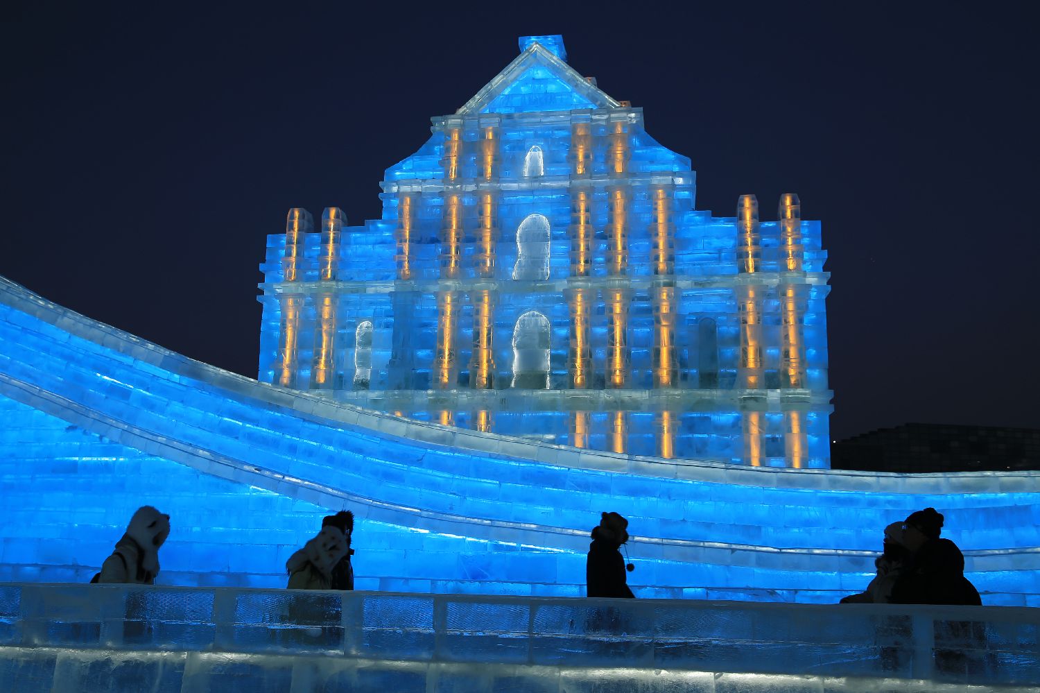 第26届哈尔滨冰雪大世界园区冰建景观“大三巴牌坊”。(图片来源:中新社)