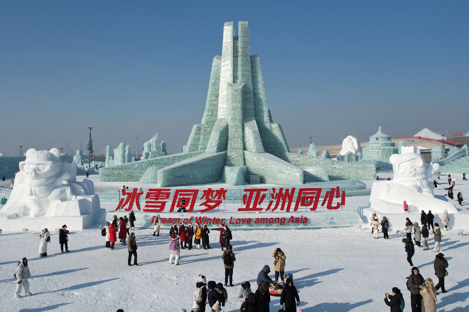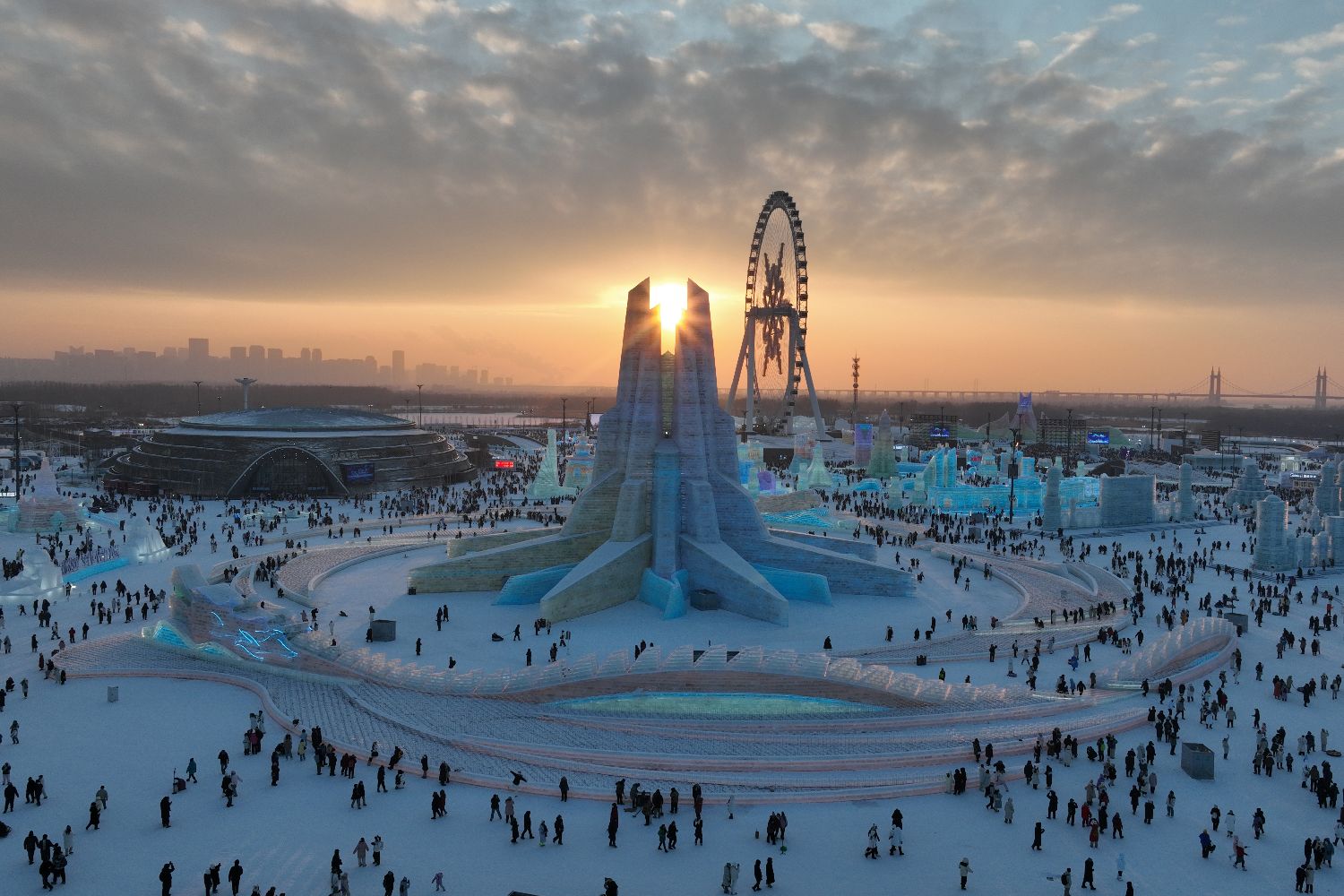 第26届哈尔滨冰雪大世界主塔“亚洲同心”。(无人机照片)(图片来源:中新社)