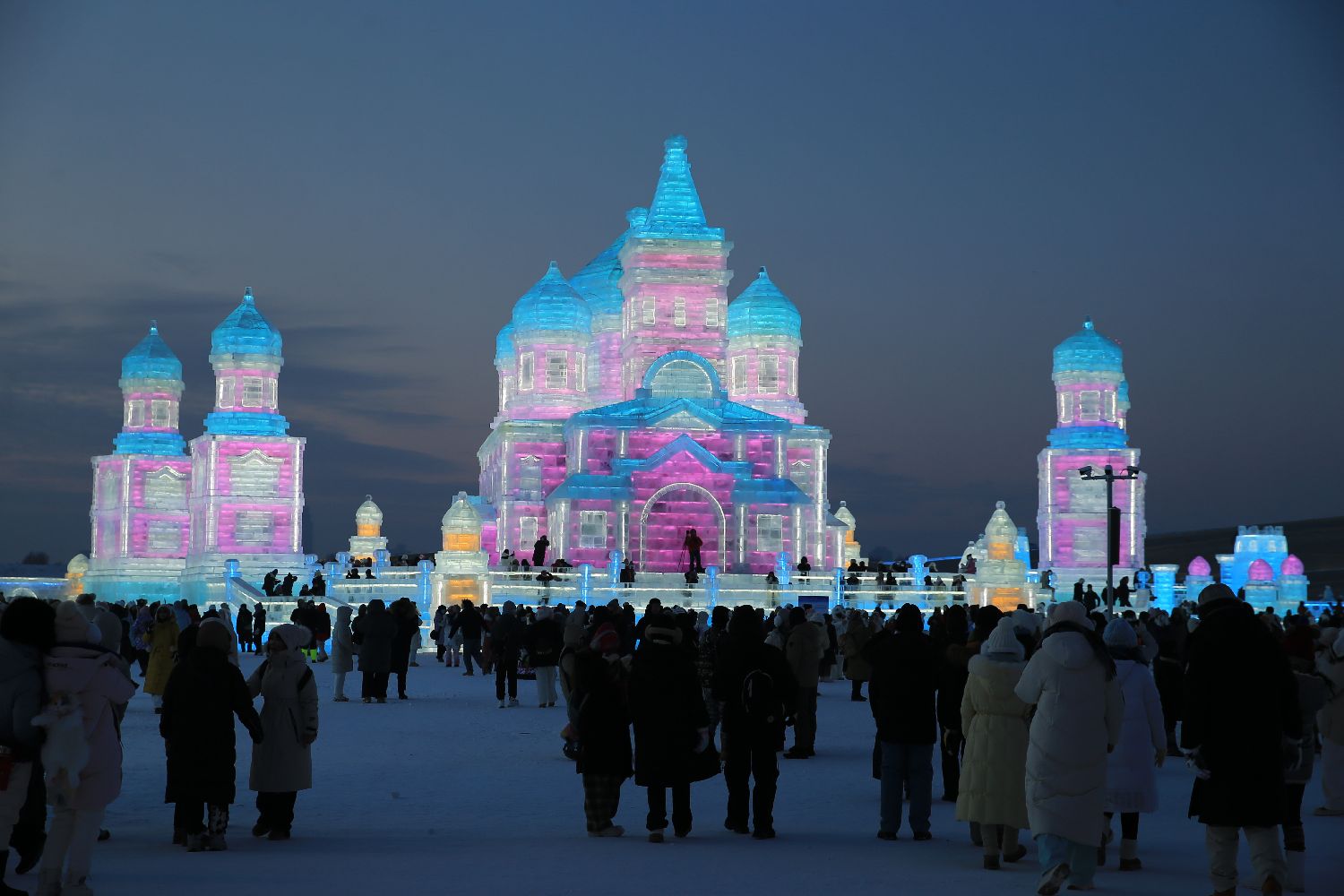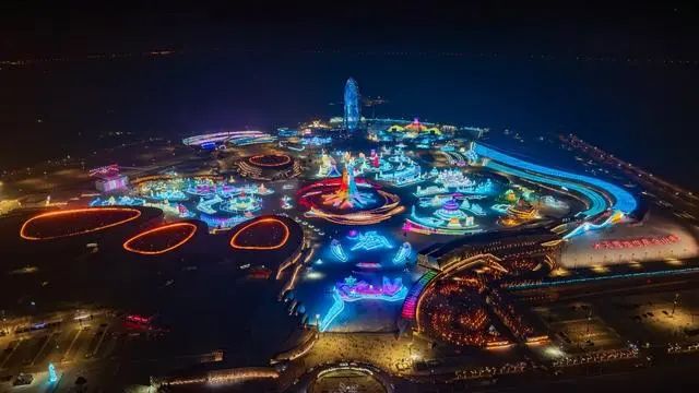 哈尔滨冰雪大世界园区内的冰雪景观亮起缤纷的彩灯,将冰城的冬夜装点得格外美丽。(图片来源:北京中国日报网)