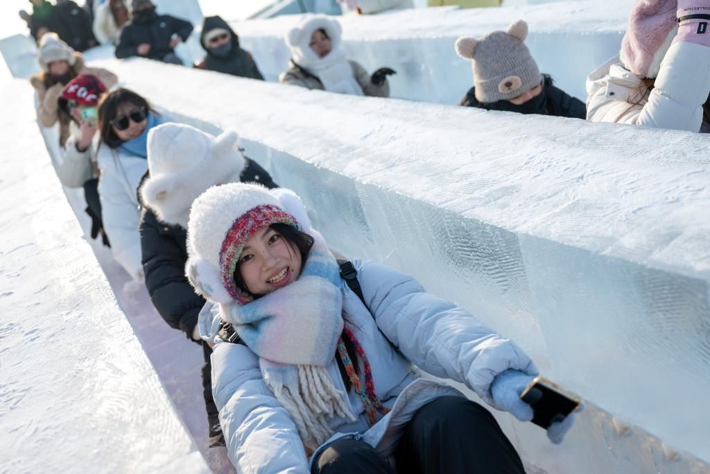 游客在哈尔滨冰雪大世界园区内玩滑梯。(图片来源:新华社)