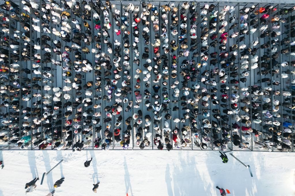 游客在哈尔滨冰雪大世界园区内排队(无人机照片)。(图片来源:新华社)