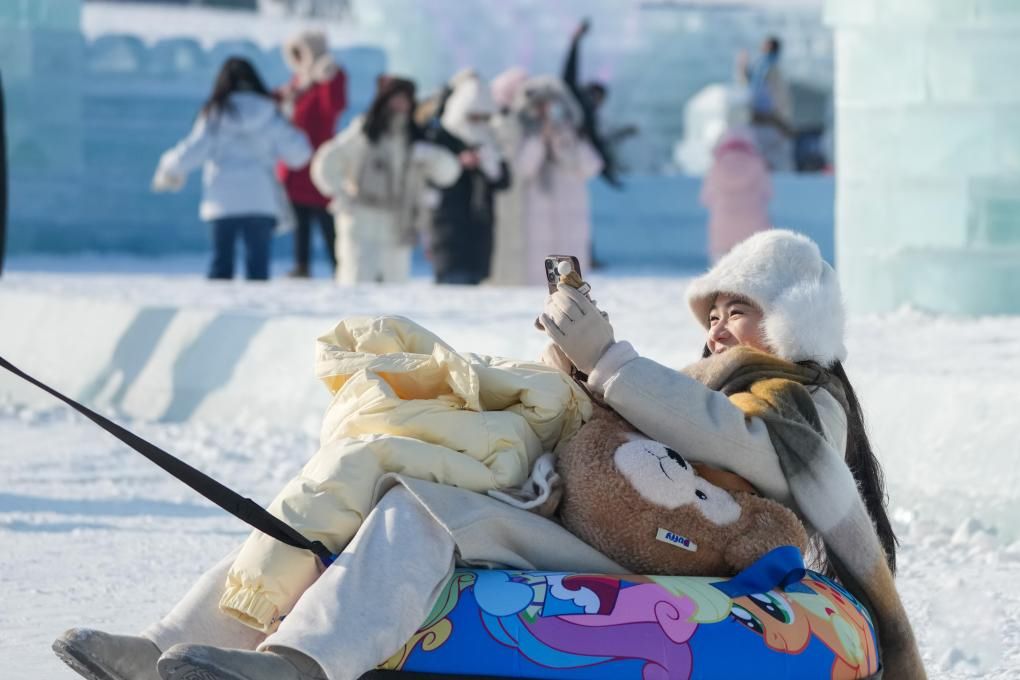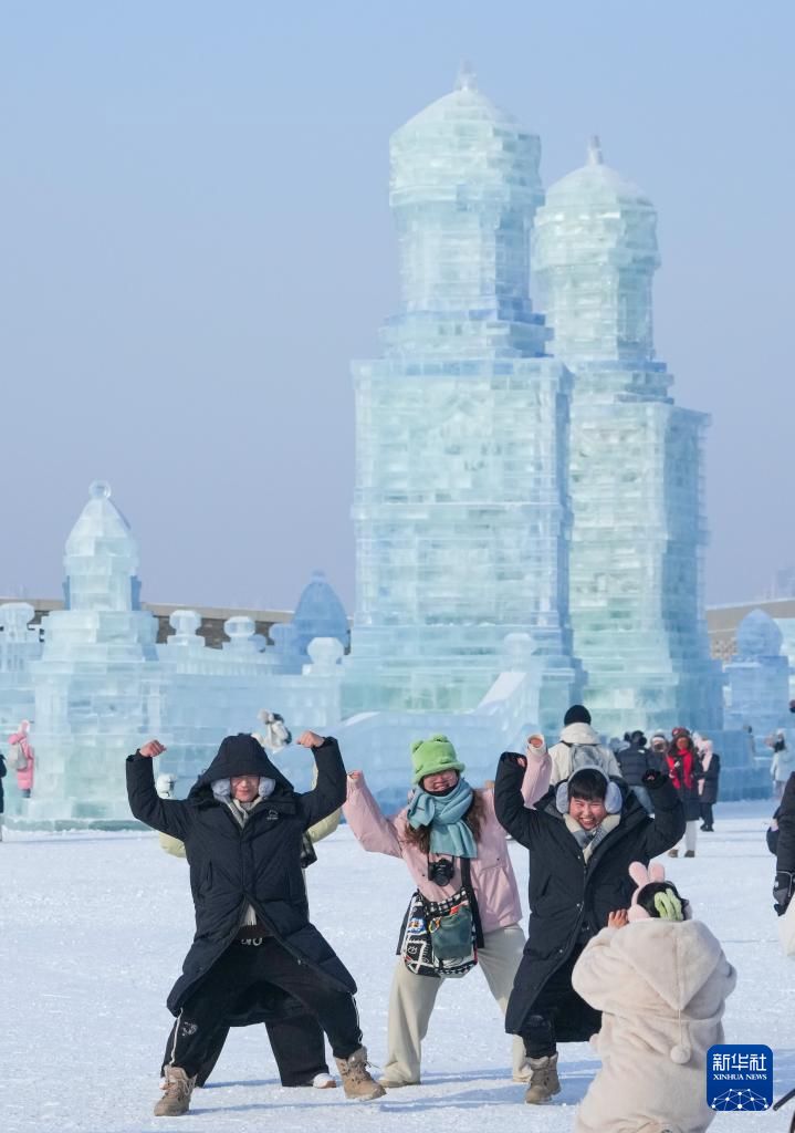 游客在哈尔滨冰雪大世界园区游玩、拍照。(图片来源:新华社)
