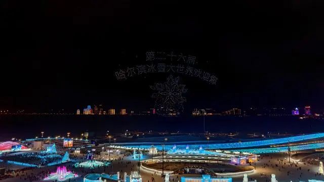 第26届哈尔滨冰雪大世界园区21日还上演了惊艳震撼的无人机表演,千架无人机组成的编队腾空而起摆出各种各样的造型。(图片来源:北京中国日报网)