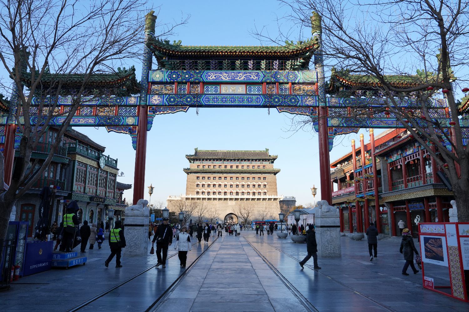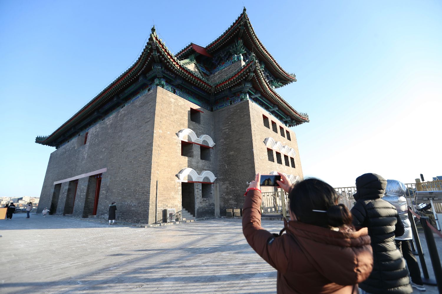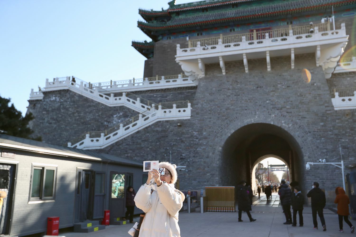 参观者从正阳门箭楼门洞前经过。(图片来源:中新社)