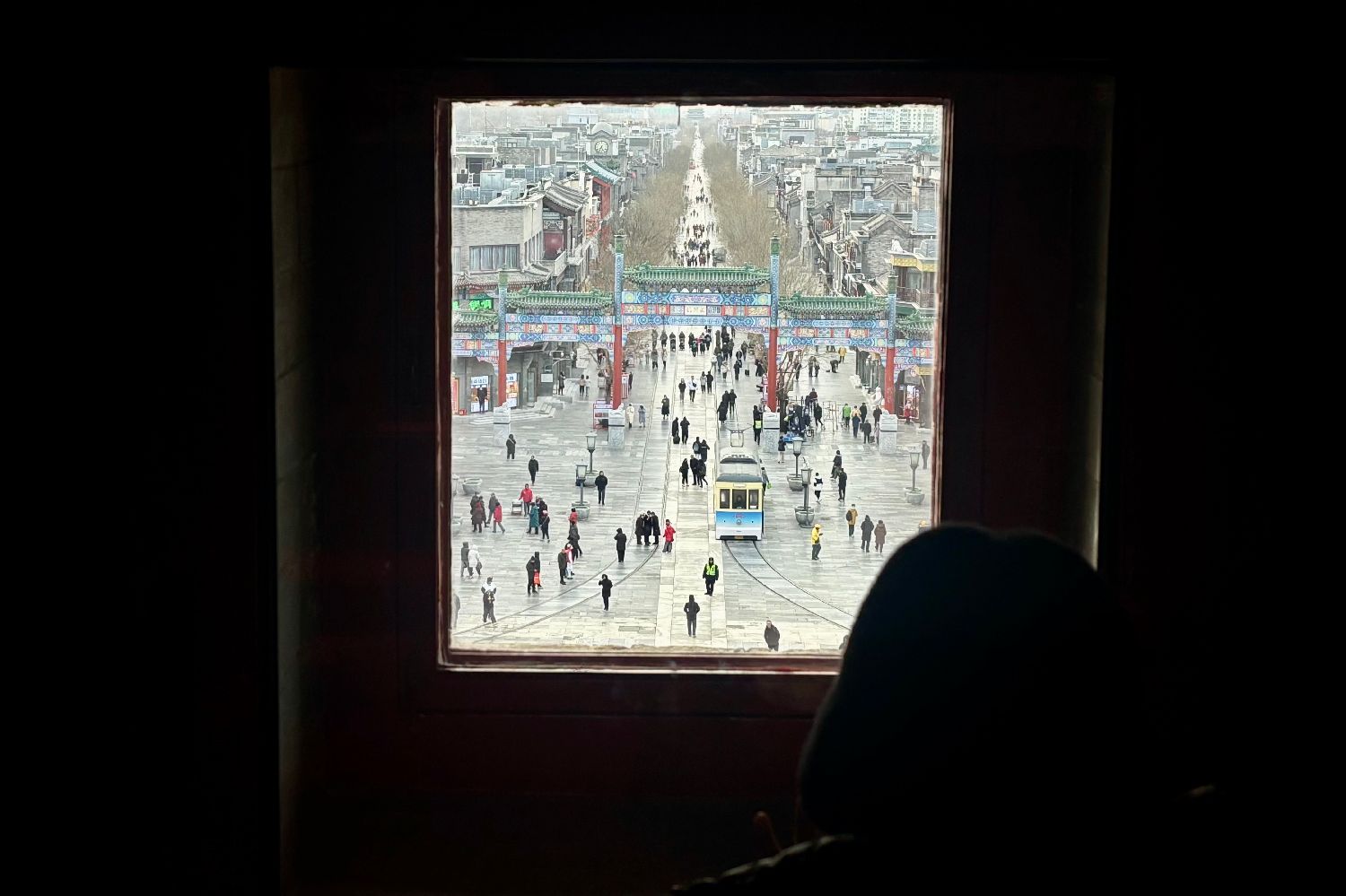 参观者透过箭窗眺望南中轴景观。(图片来源:中新社)