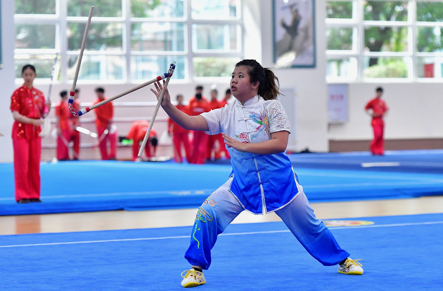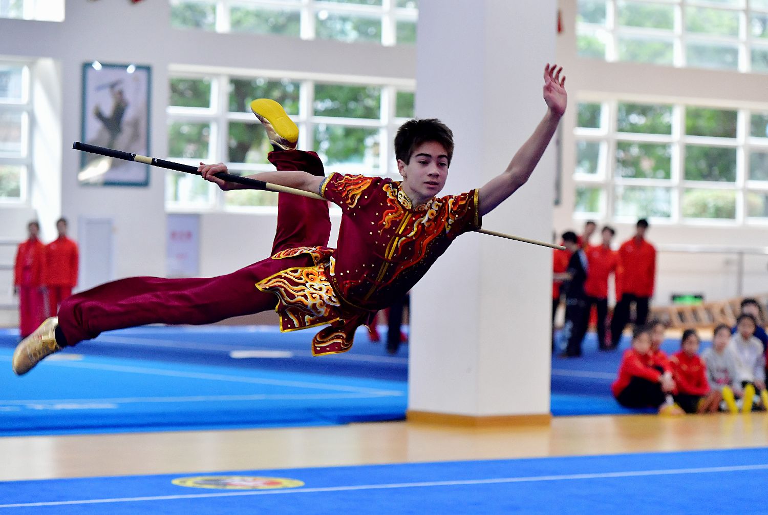 美国青年在交流活动上表演齐眉棍。