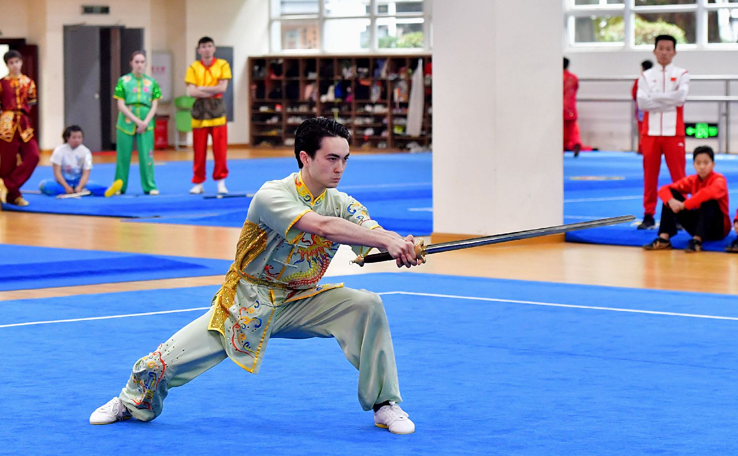 美国青年在交流活动上表演双手剑。