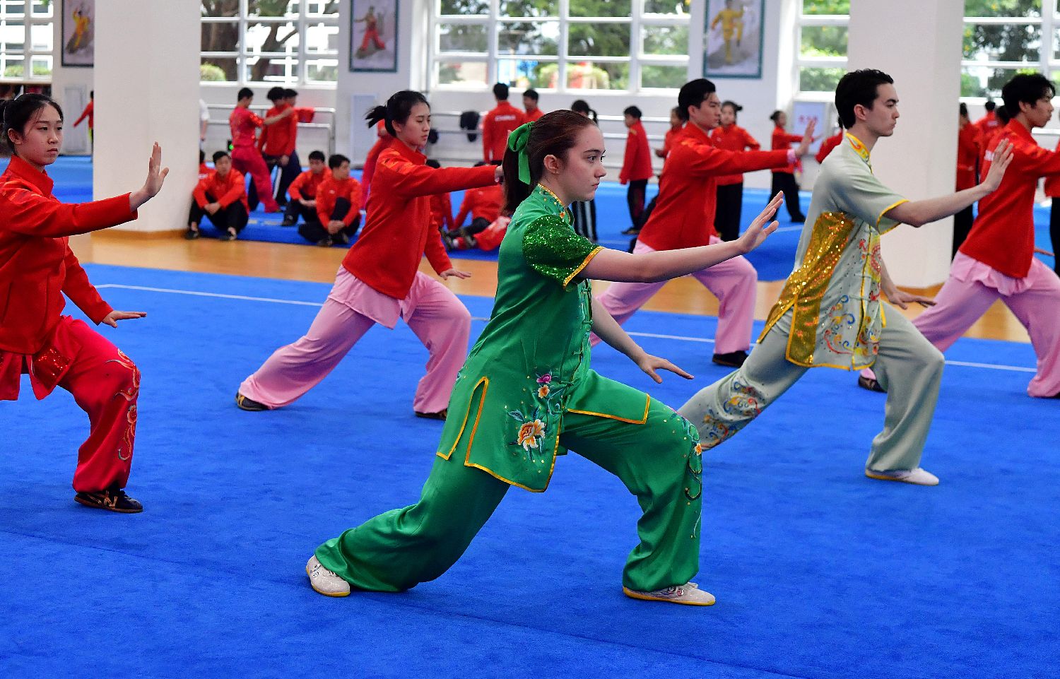 美国青年与福建省武术运动管理中心运动员一起打太极拳。
